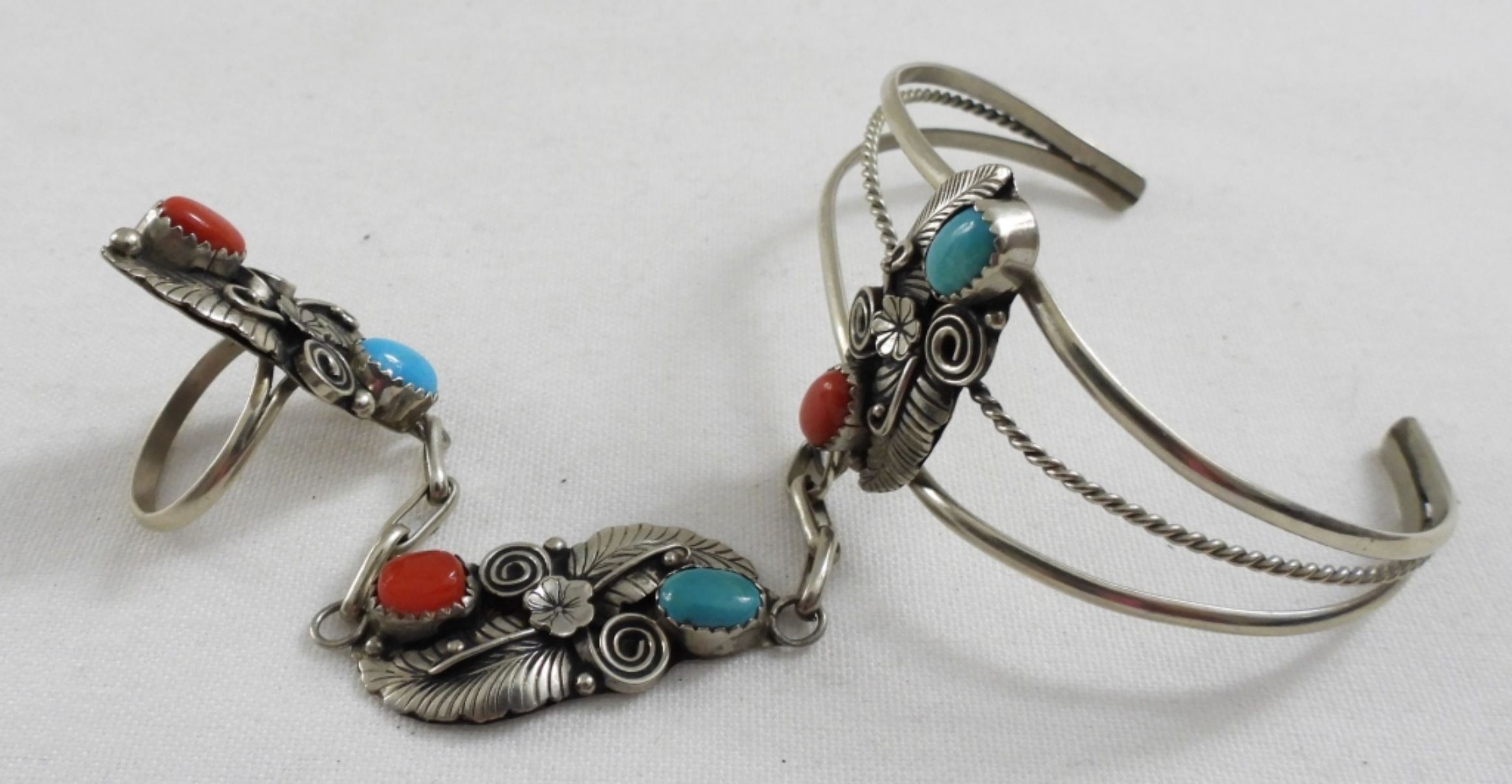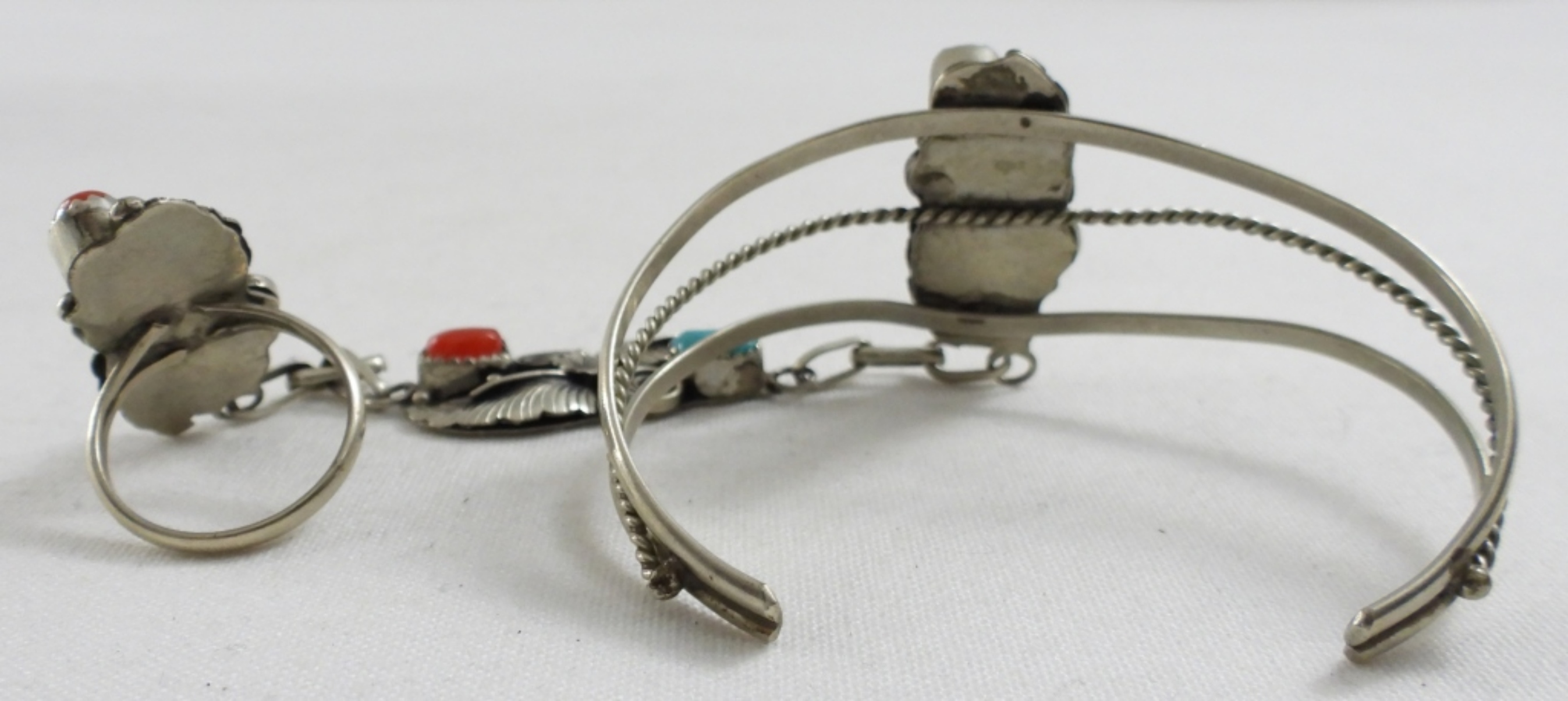 VINTAGE TURQUOISE & CORAL CUFF BRACELET WITH RING ATTACHED 925 13.9 DWT