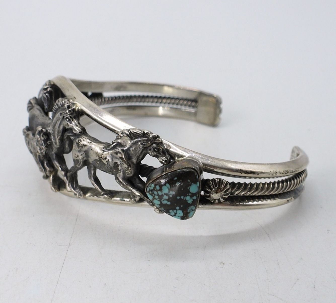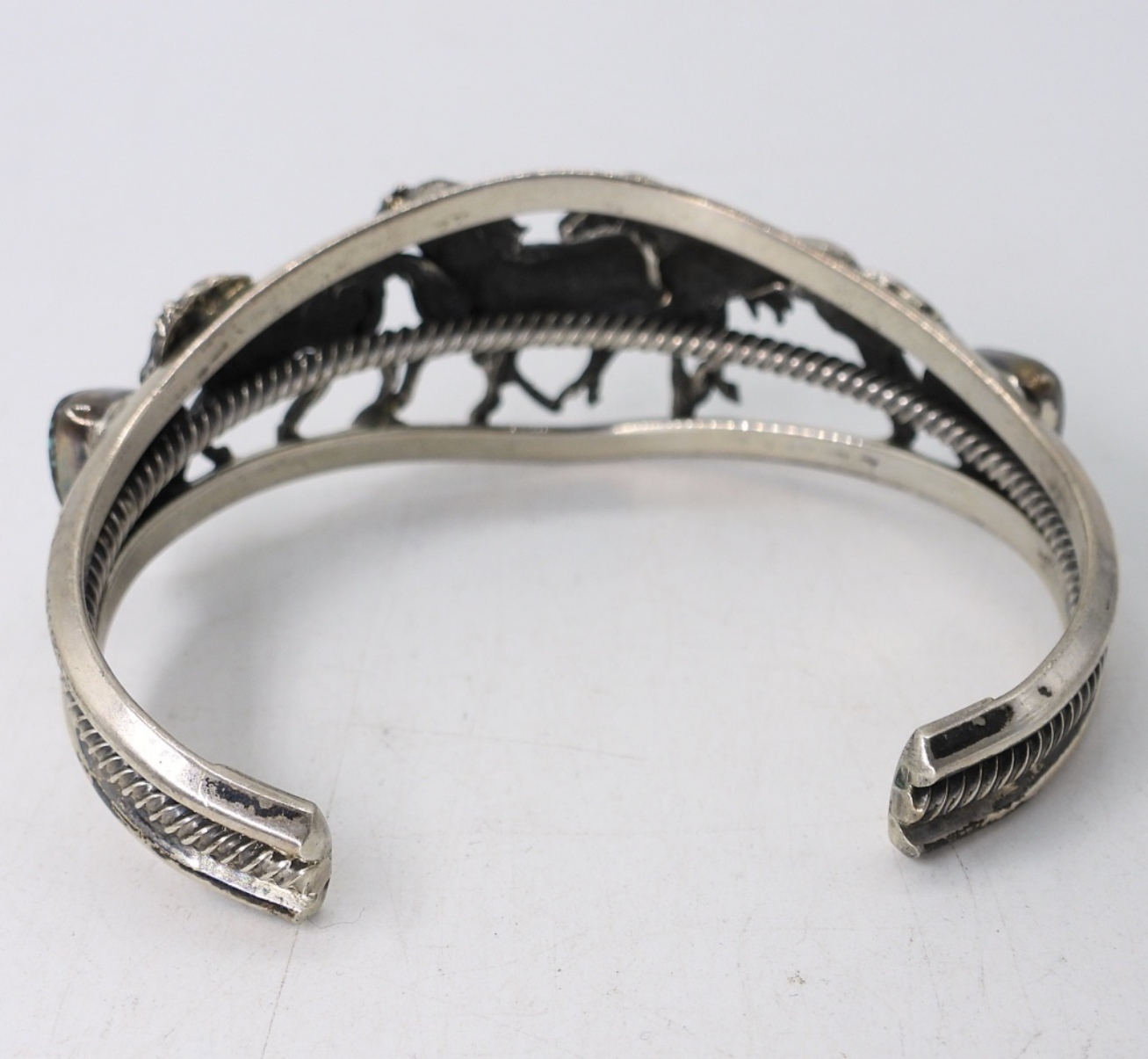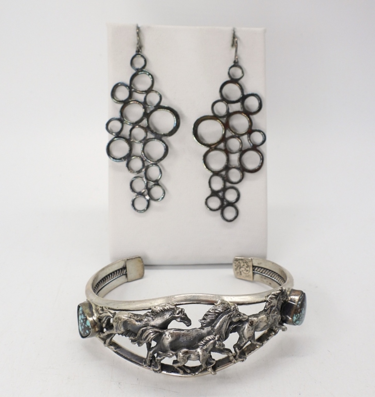 STUNNING STERLING SILVER BRACELET WITH RUNNING HORSES AND SMALL TURQUOISE GEMSTONES. ONE PAIR OF STERLING PIERCED EARRINGS. 28.8 DWT