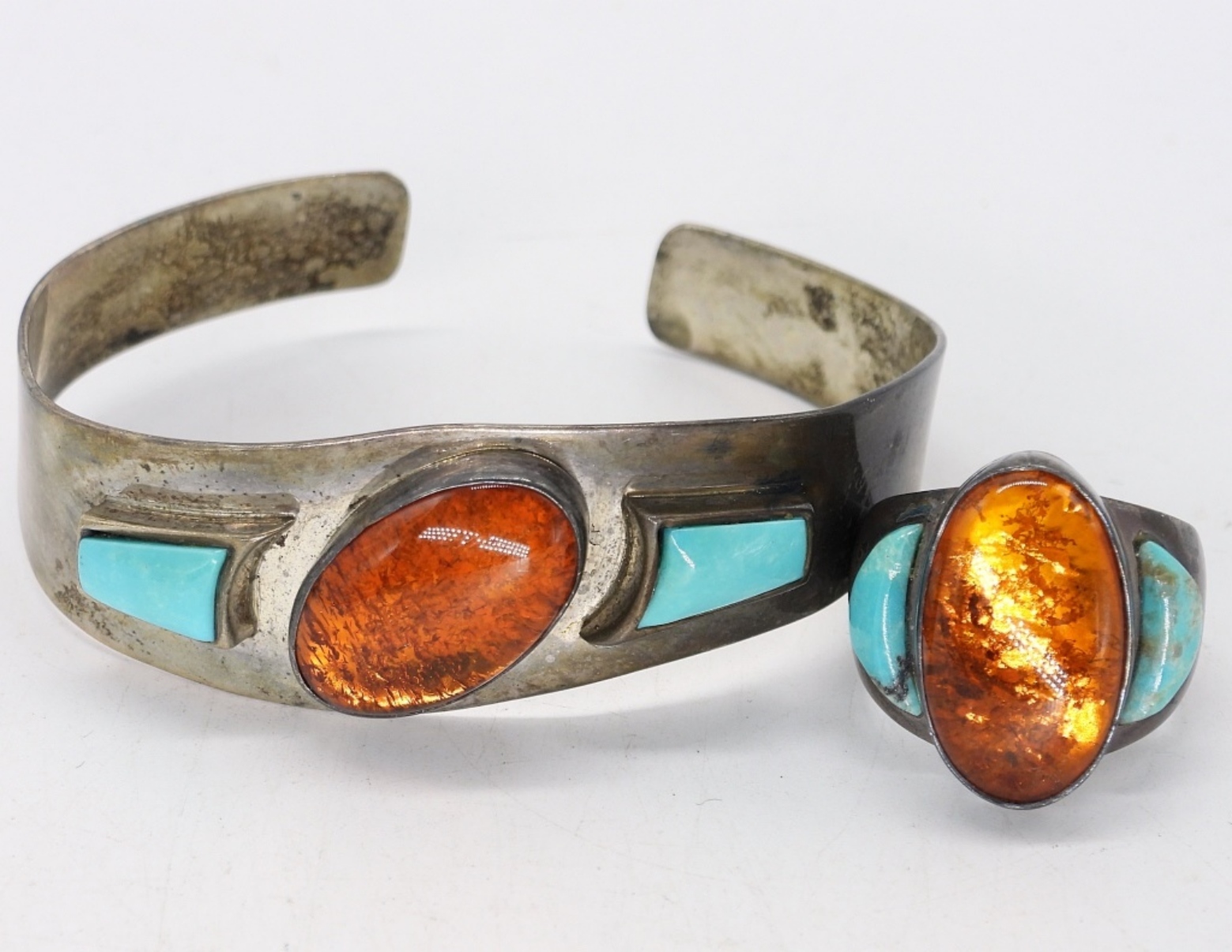 STERLING RING AND BRACELET WITH AMBER & TURQUOISE GEMSTONES. RING IS 7.5. BRACELET IS 7″. 19 DWT