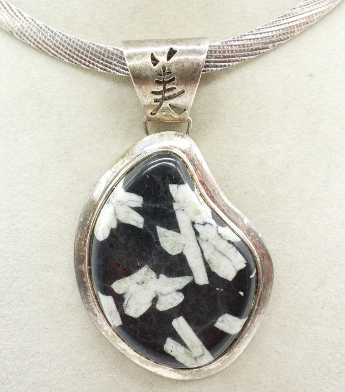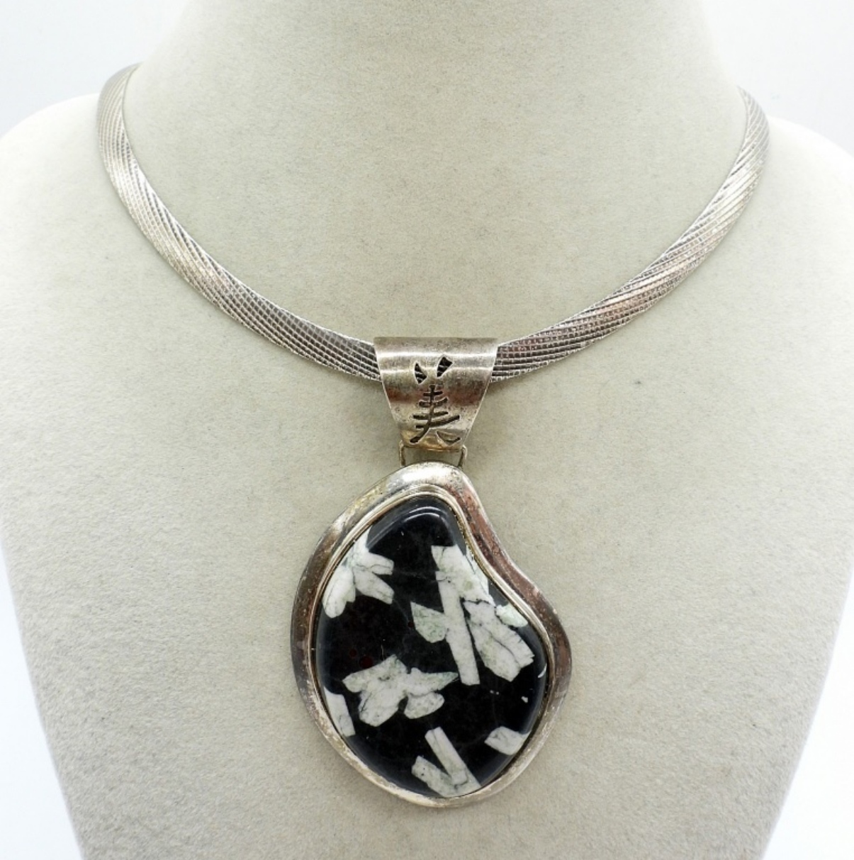 18″ STERLING CHAIN WITH A LARGE STERLING “CHINESE WRITING STONE” GEMSTONE. 38.7 DWT