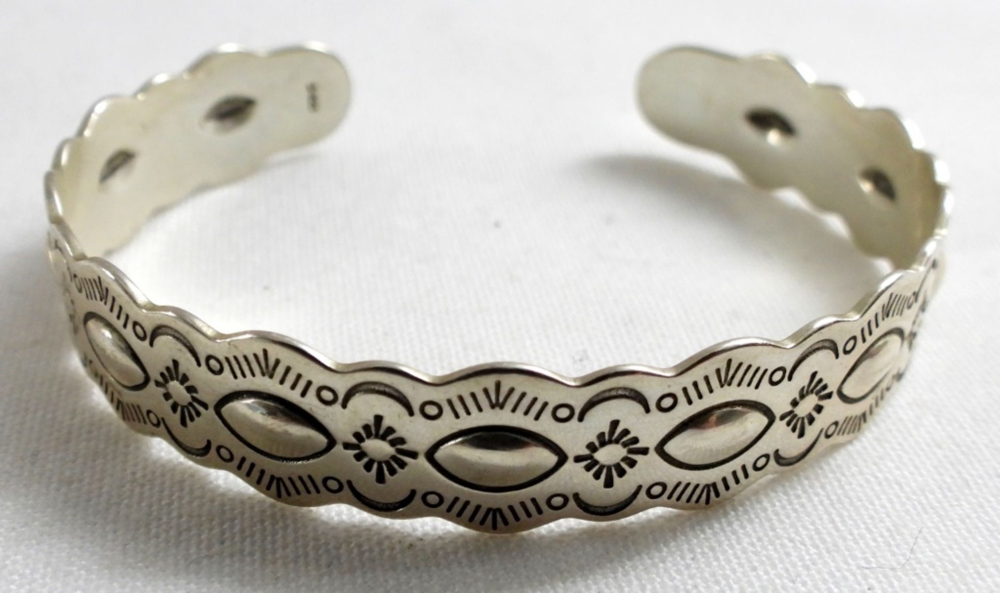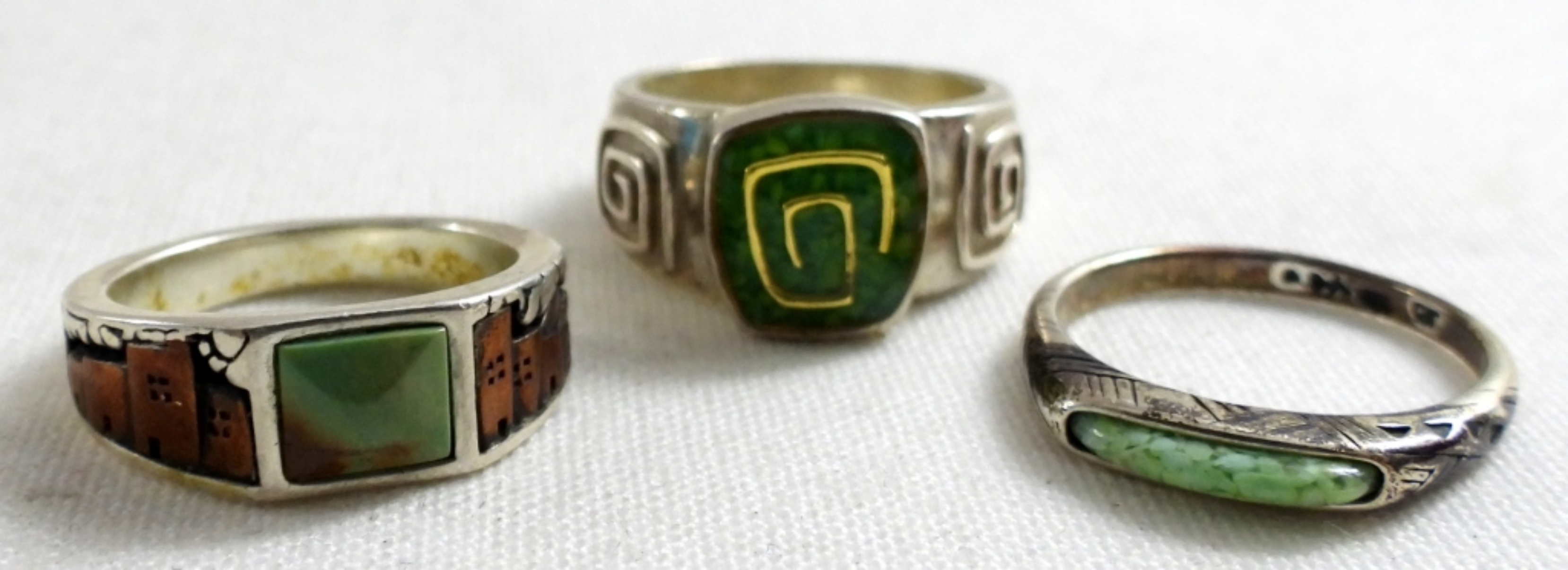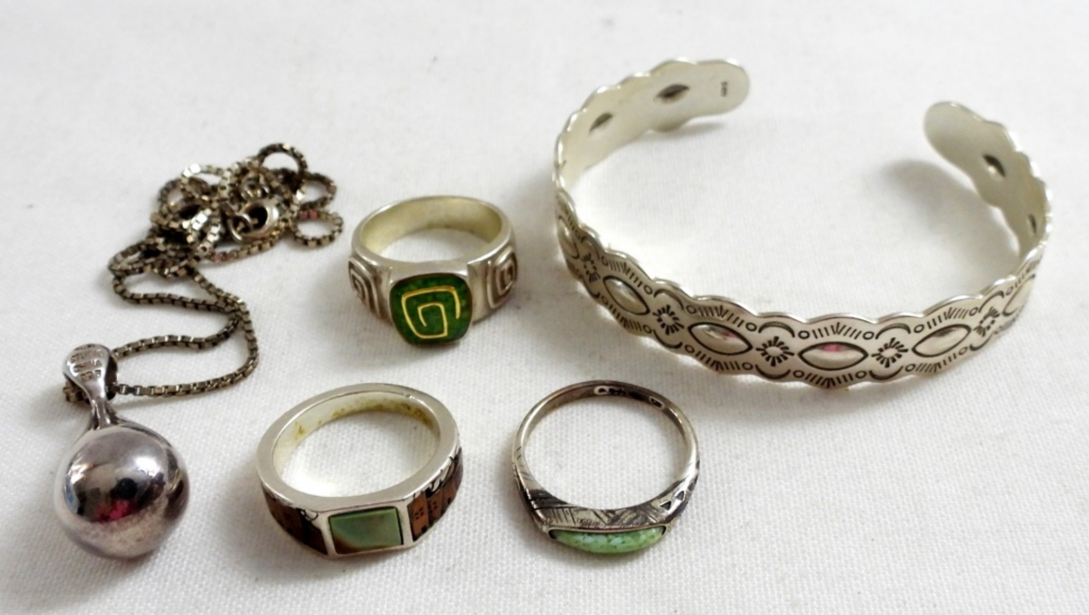 3 RINGS WITH ETCHINGS & GEMSTONES. SIZE 7. STERLING NECKLACE 20″. SOUTHWEST STYLE CUFF BRACELET. 25 DWT