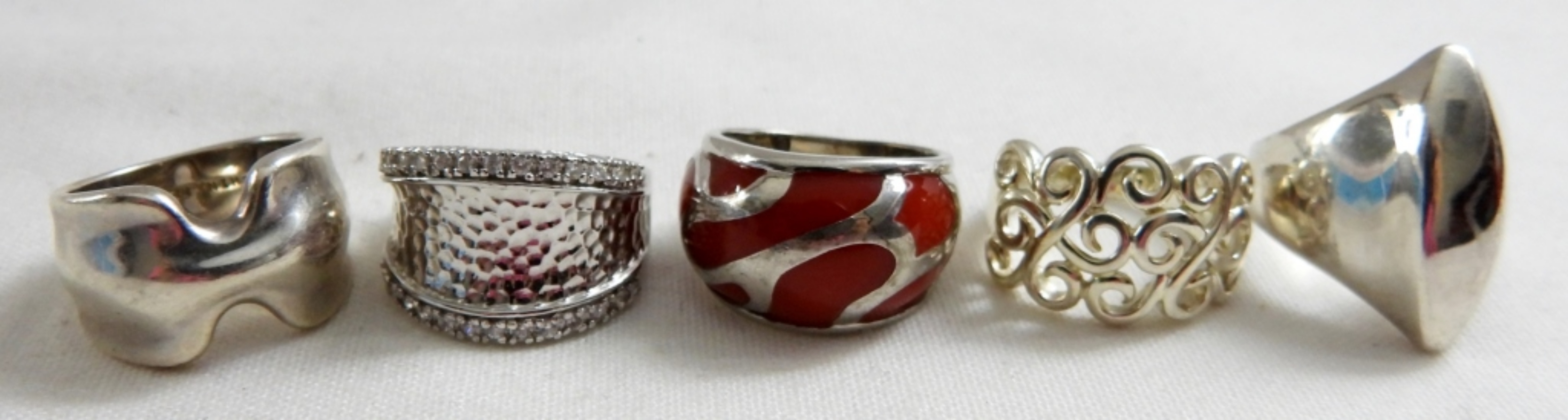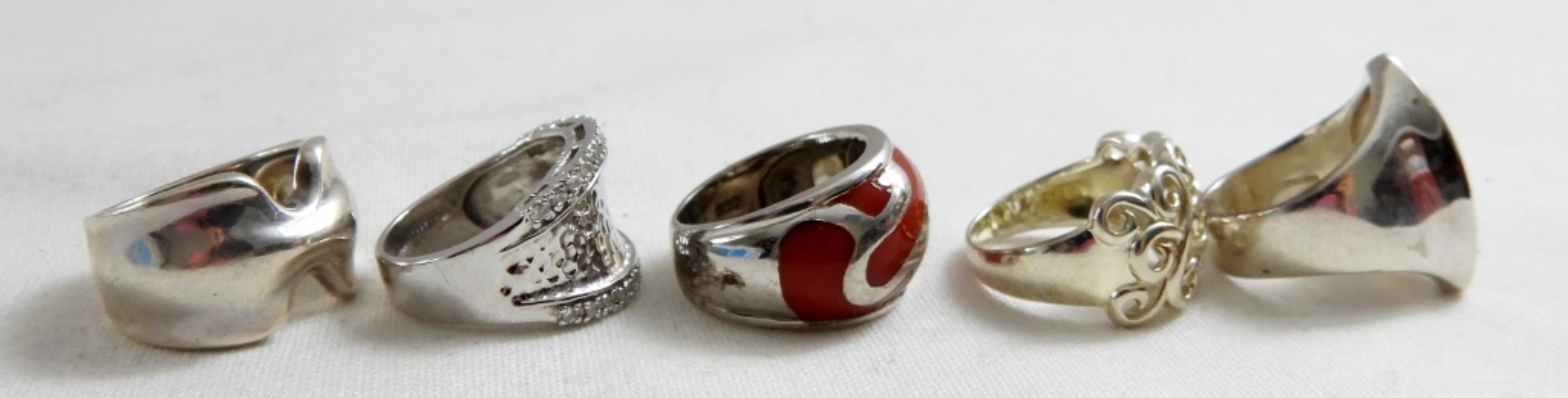 FIVE STERLING CHUNKY FASHION RINGS. SIZES 7. 24.8 DWT