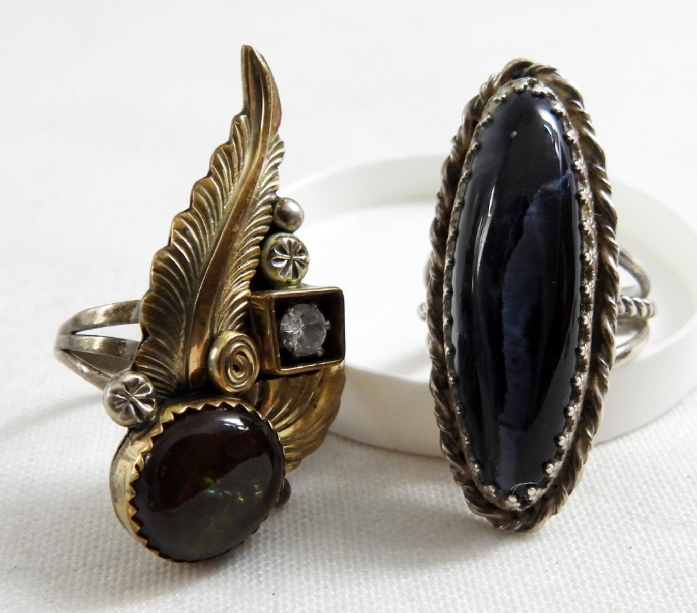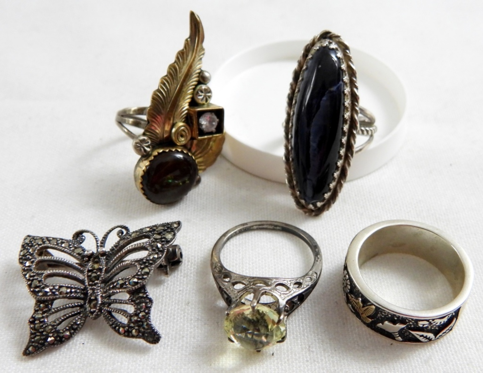 FOUR RINGS & ONE BROOCH. INCREDIBLE GEMSTONES! RINGS ARE SIZES 6-7. 20.1 DWT