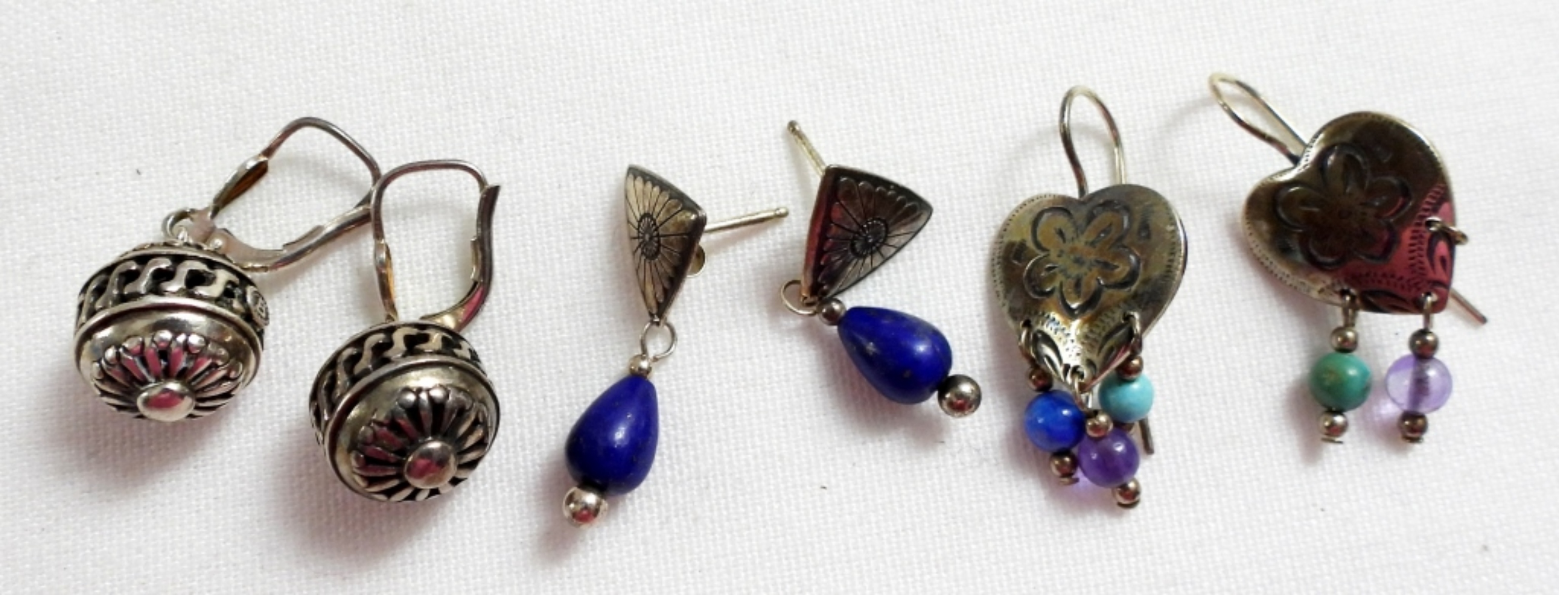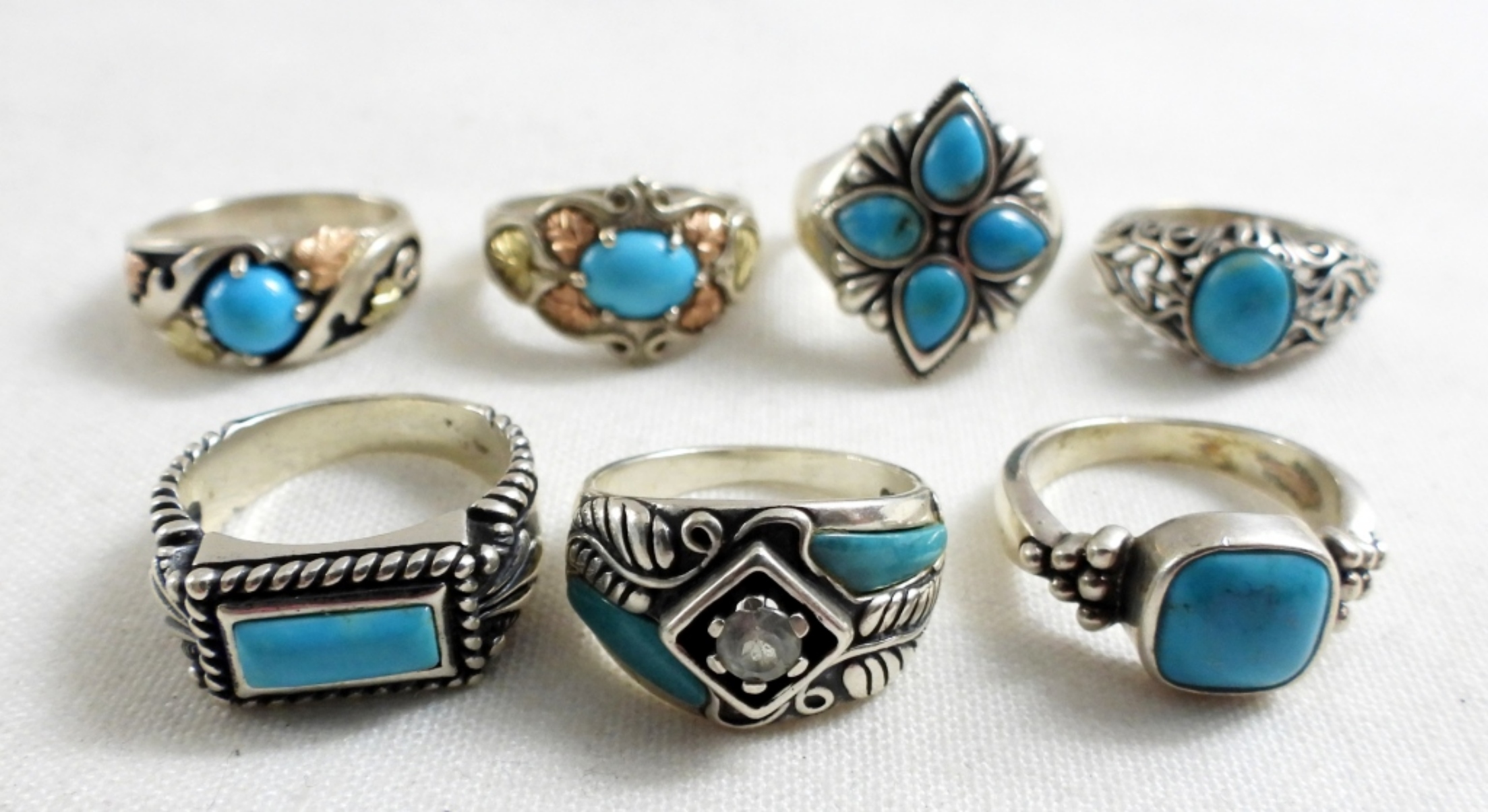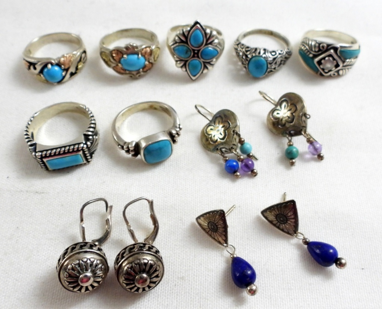 TWO STERLING RINGS WITH BLACK HILLS GOLD 12K ACCENTS, SIZE 7. FIVE STERLING LIGHT BLUE GEMSTONE RINGS, 6.5-7. 3 PAIR OF PIERCED STERLING EARRINGS. 32 DWT