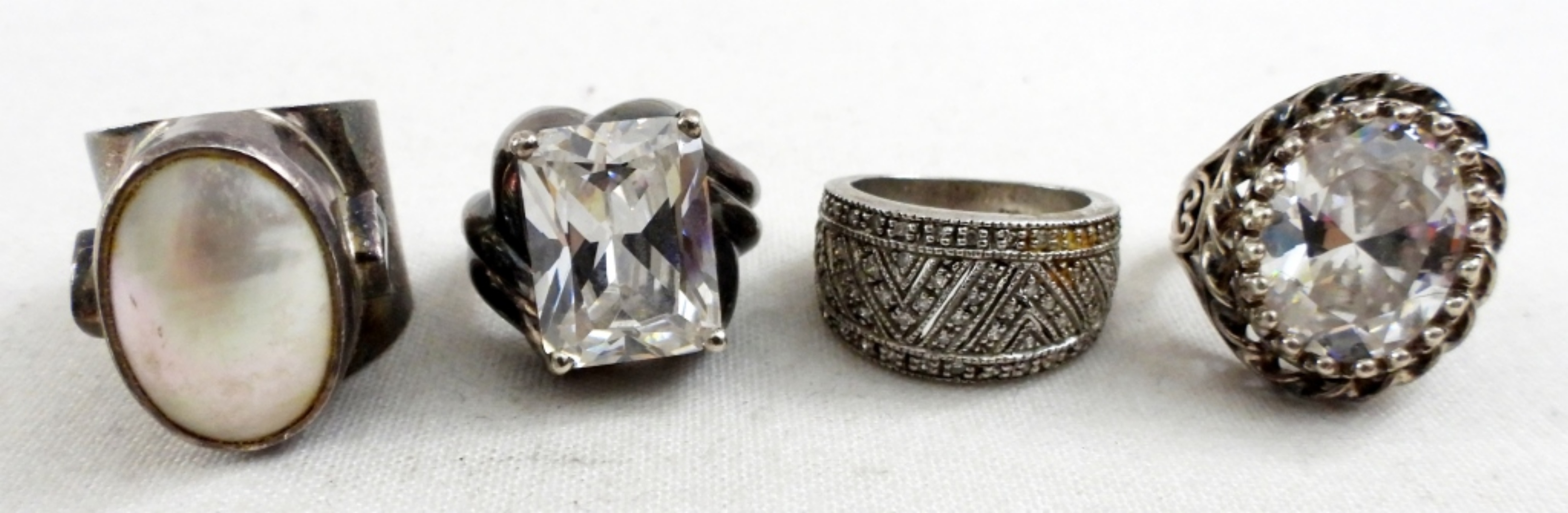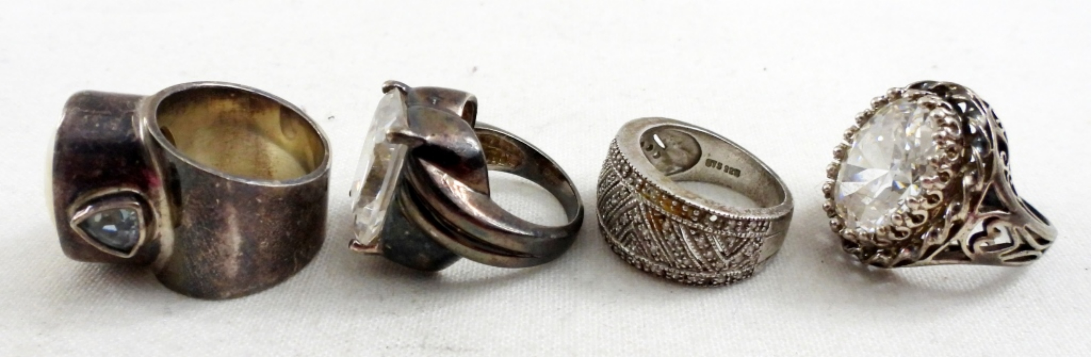 FOUR STERLING FASHION GEMSTONE RINGS. SIZES 5, 6, 7. 30 DWT
