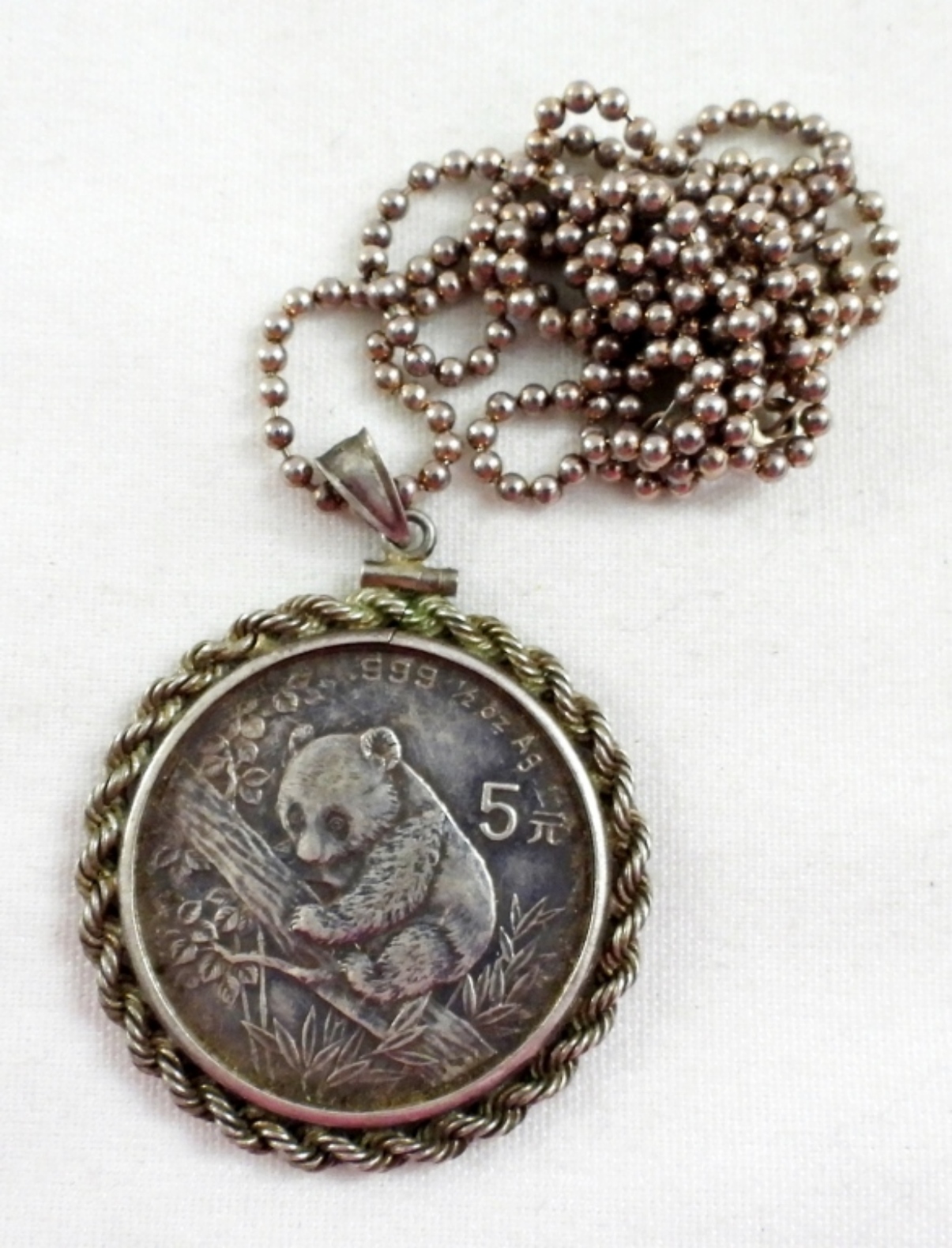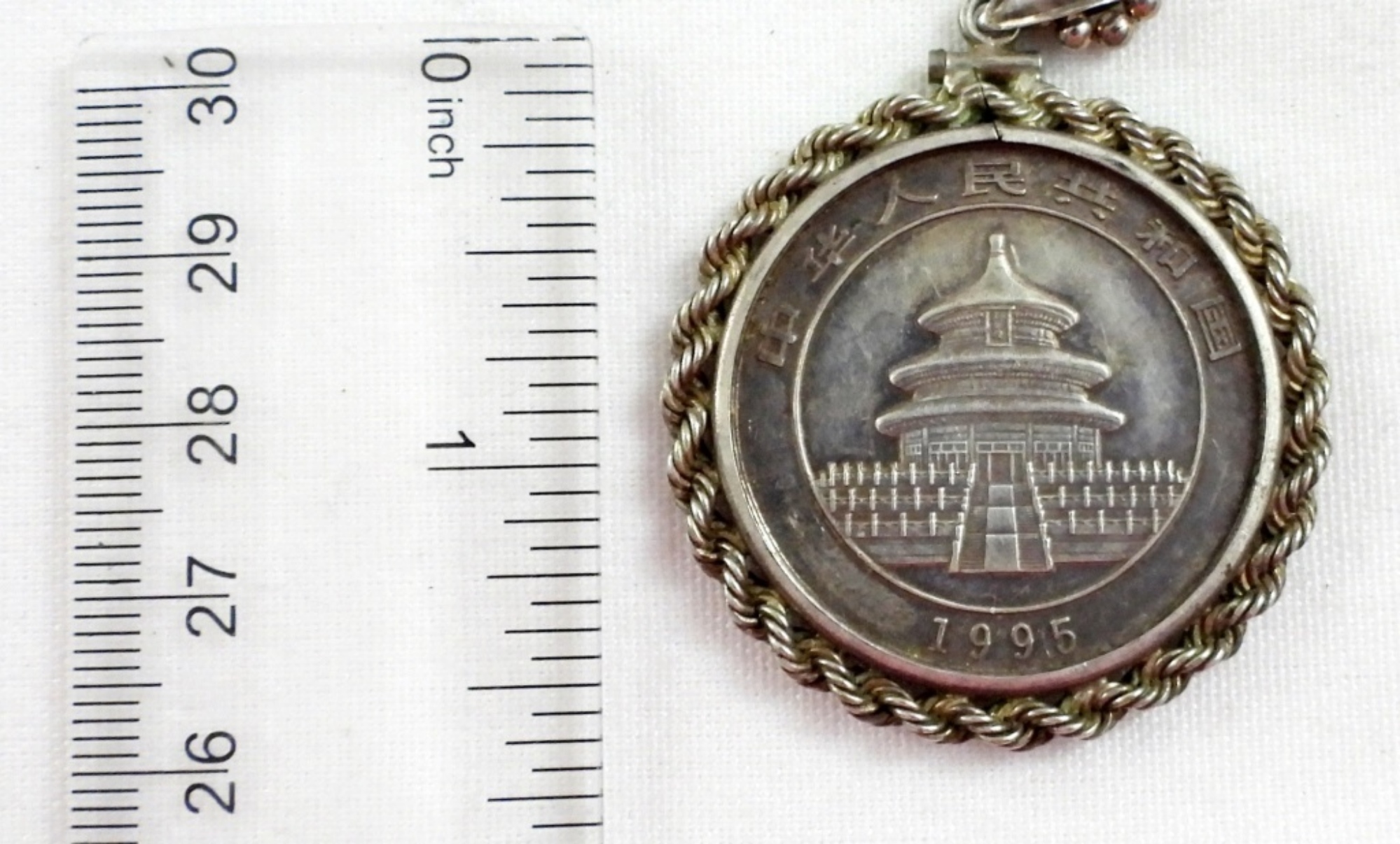 1995 PANDA COIN NECKLACE, 999 SILVER. 925 CHAIN IS 30″. 20.9 DWT