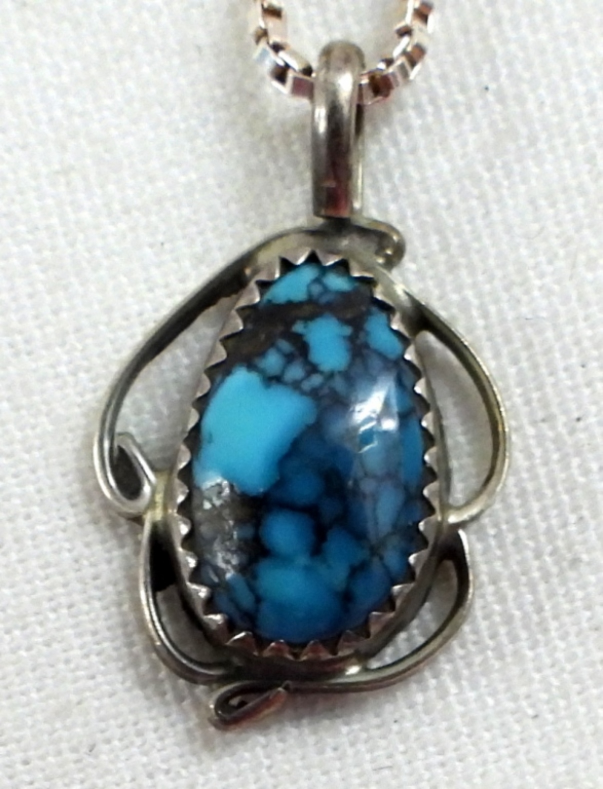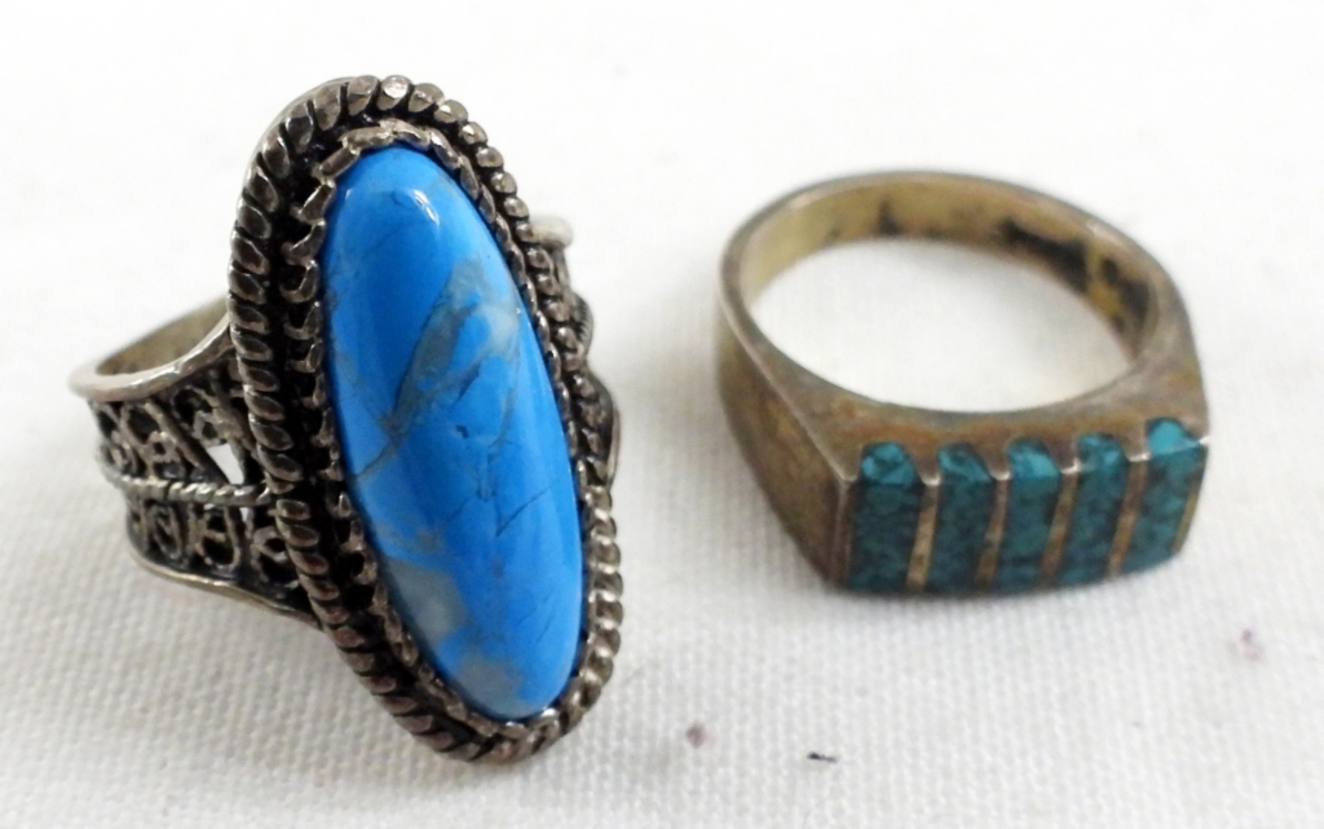 TWO STERLING TURQUOISE GEMSTONE RINGS, SIZE 8. STERLING TURQUOISE GEMSTONE PENDANT ON A 18″ CHAIN. 13.2 DWT