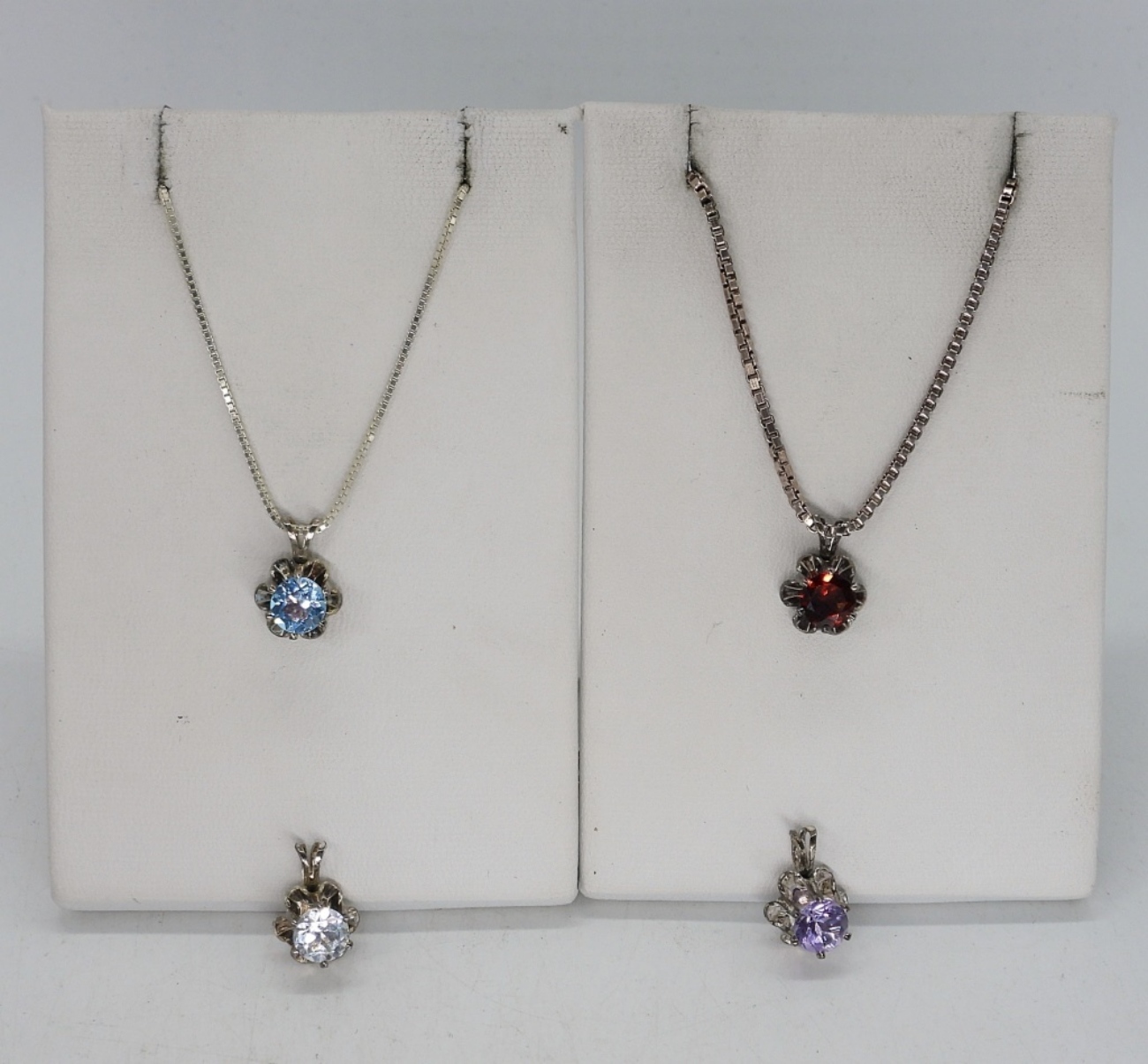 FOUR VINTAGE GEMSTONE PENDANTS, VERY PRETTY. TWO STERLING BOX CHAINS, 20″ & 36″. 11.7 DWT