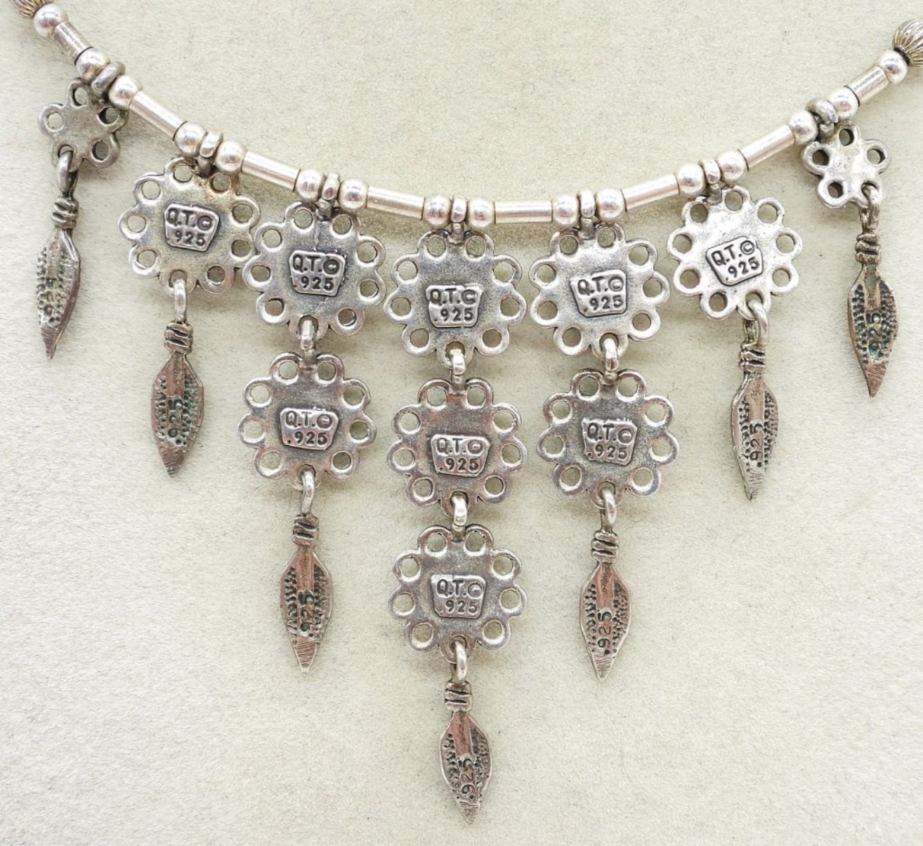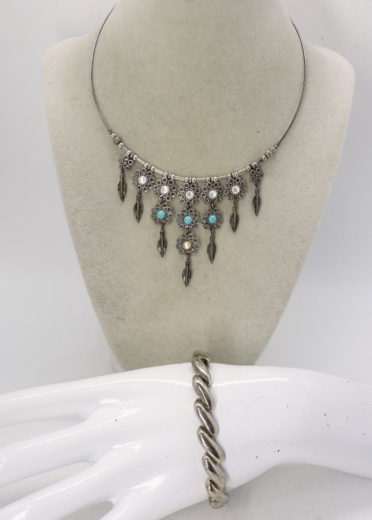STERLING COLLAR STYLE FLOWER NECKLACE WITH GEMSTONES AND A VINTAGE STERLING BRACELET. 31.5 DWT