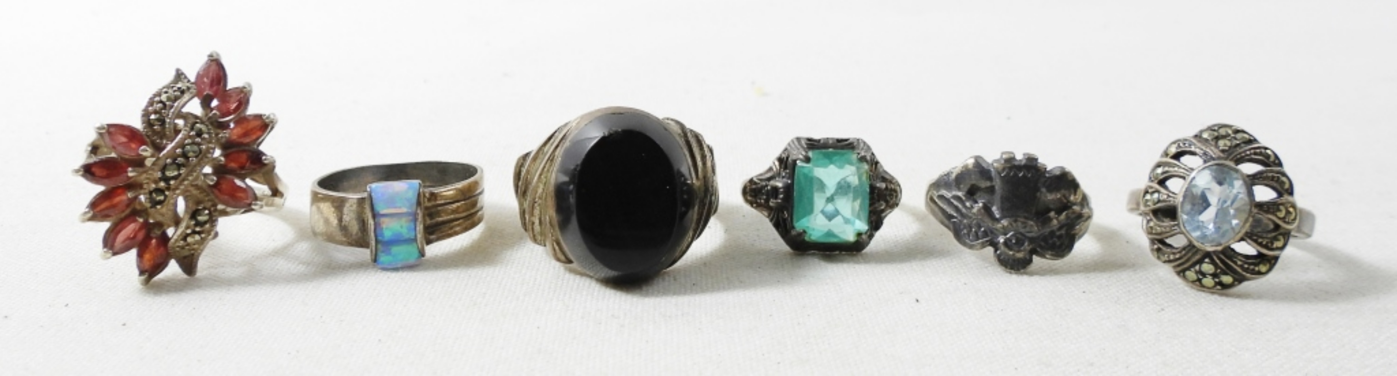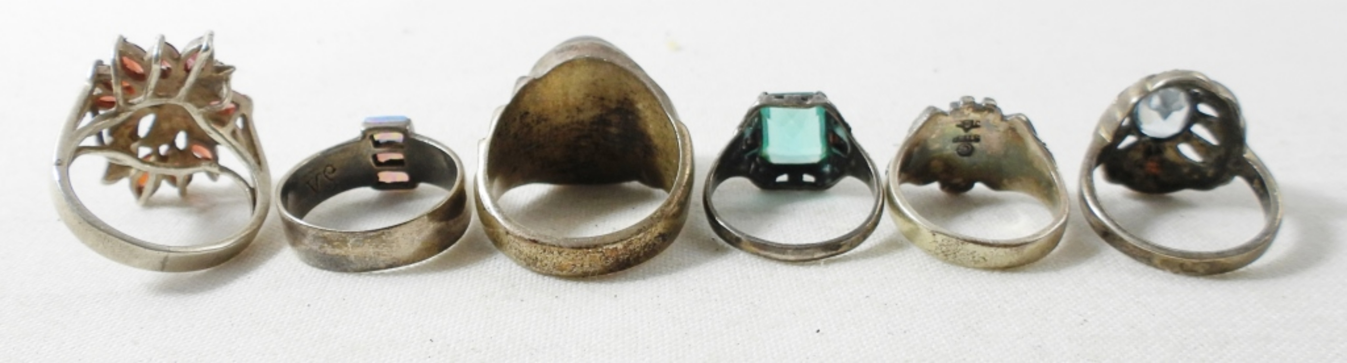 (6 )VINTAGE RINGS VARIOUS DIFFERENT COLOR GEMS & STYLES. RANGE FROM SIZE 6-10 24.8 DWT