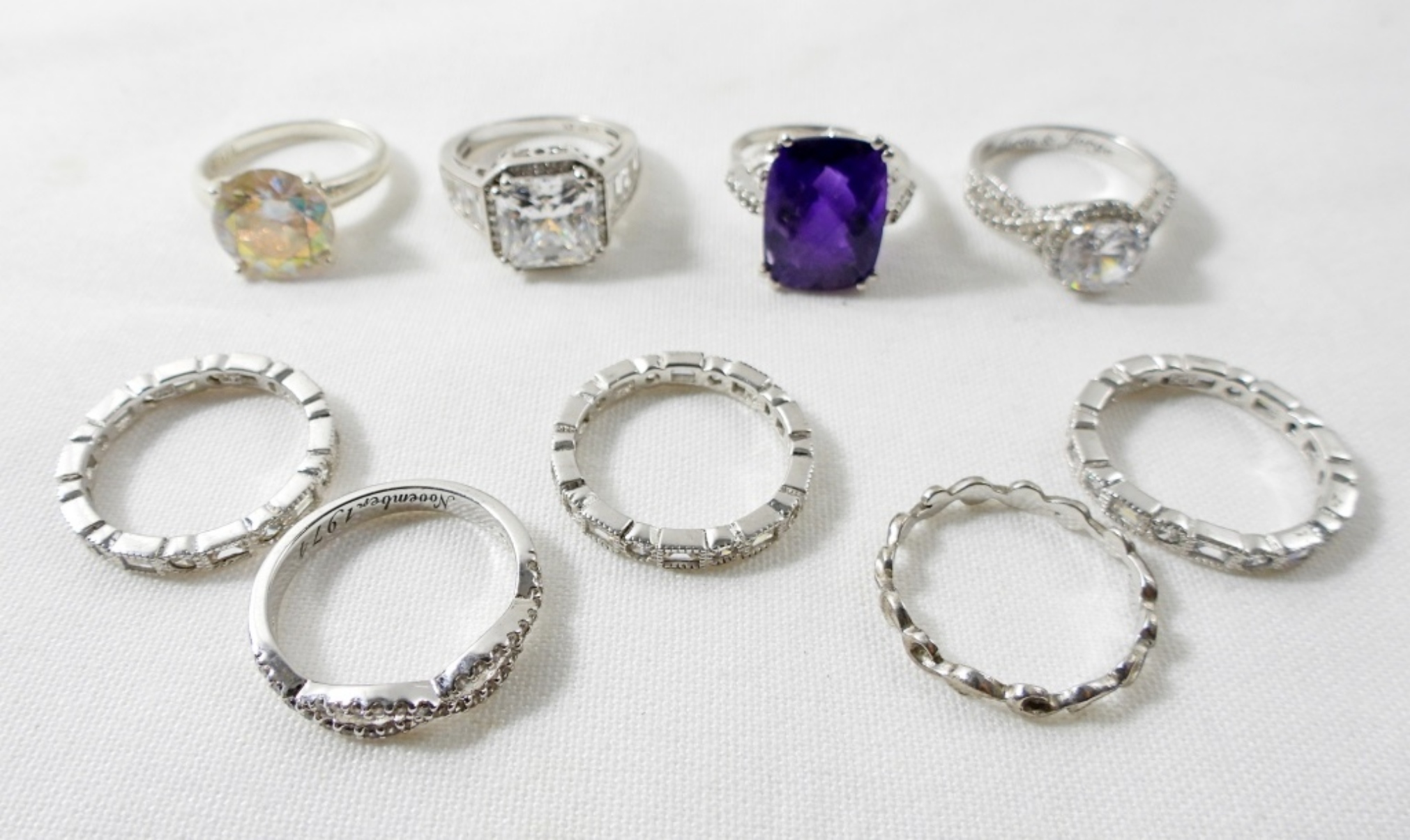 9 STUNNING RHINESTONE RINGS. CLEAR RHINESTONES , BUT ONE STUNNING PURPLE RHINESTONE RING. ALL RINGS ARE SIZE 8 21.4 DWT