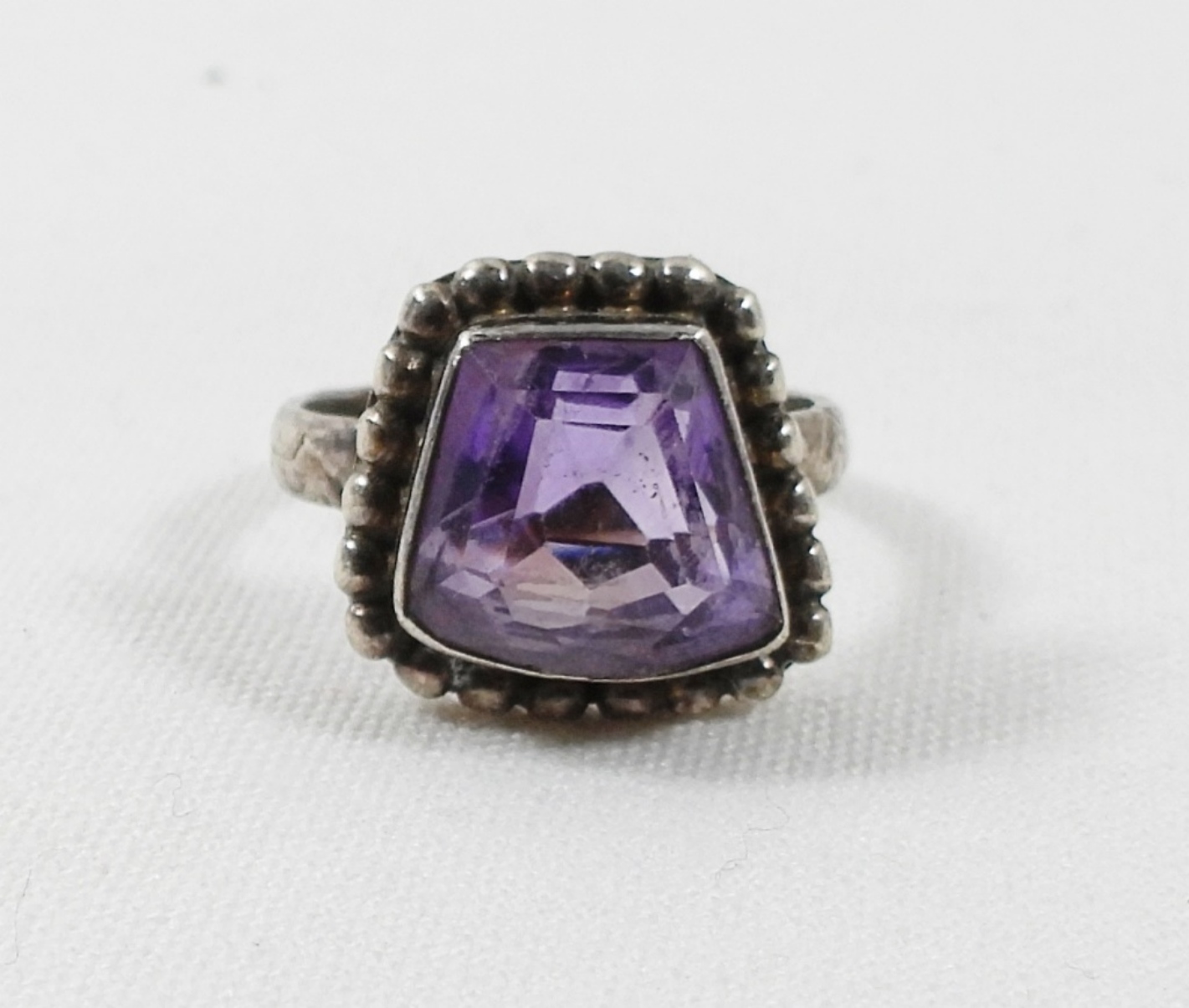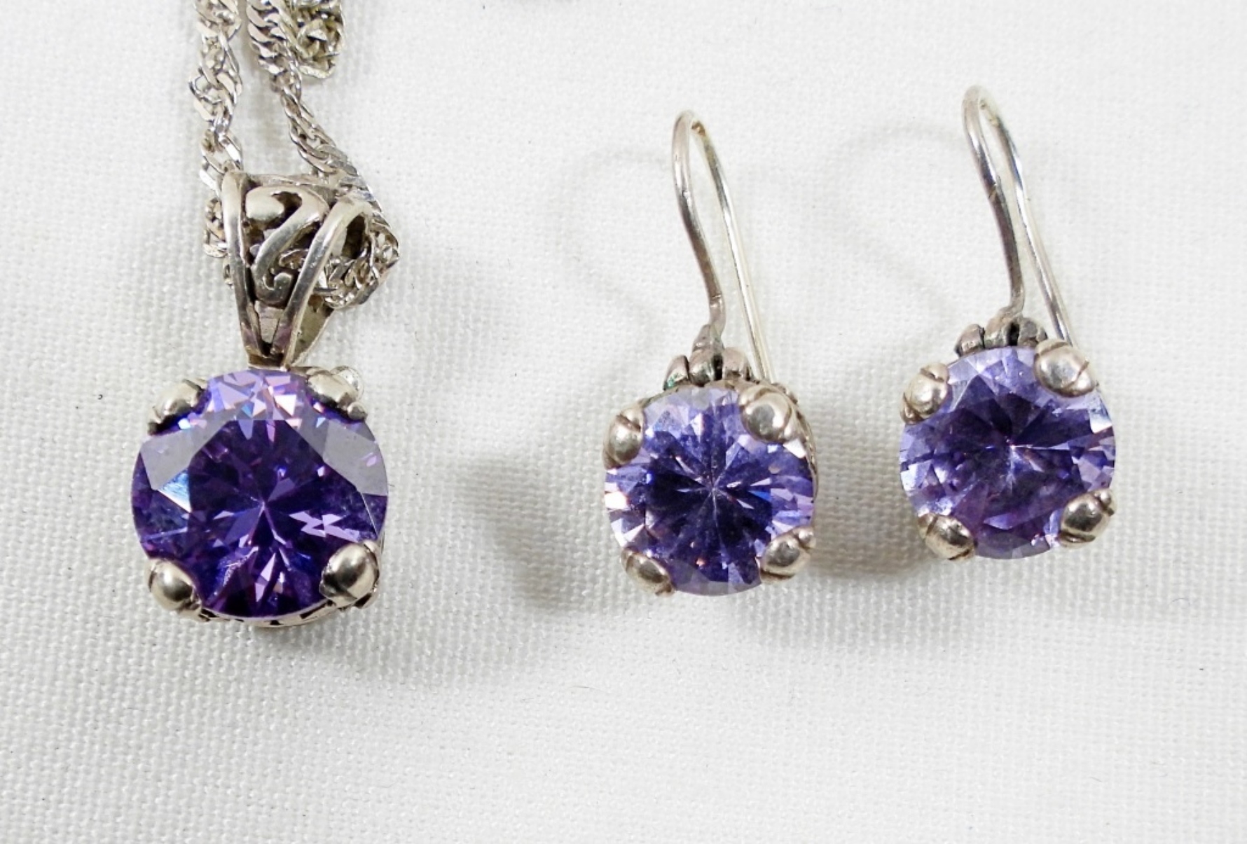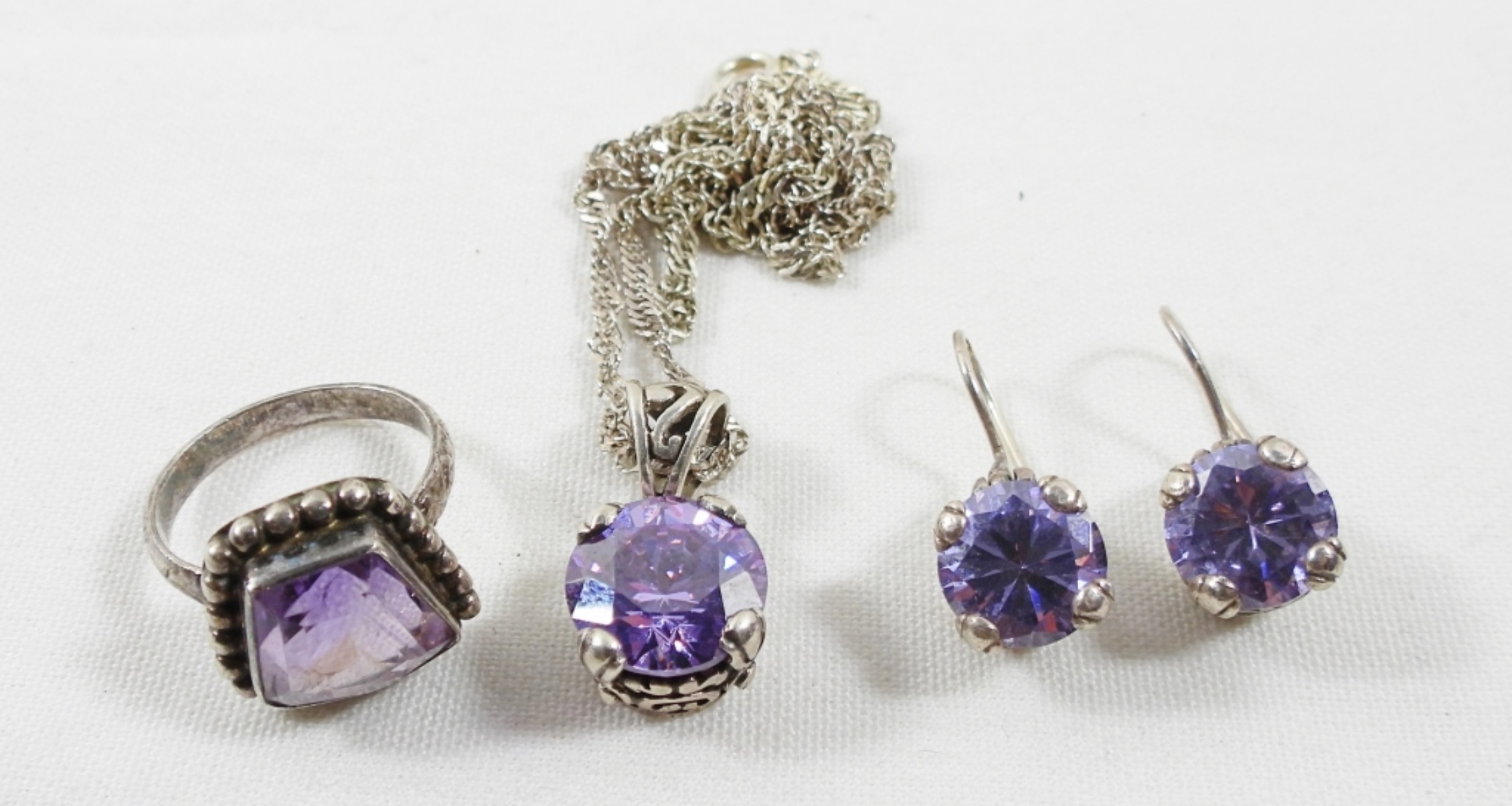 22″ NECKLACE w/PENDANT, MATCHING EARRINGS & SIZE 7.5 RING w/PURPLE STONE (15 DWT)