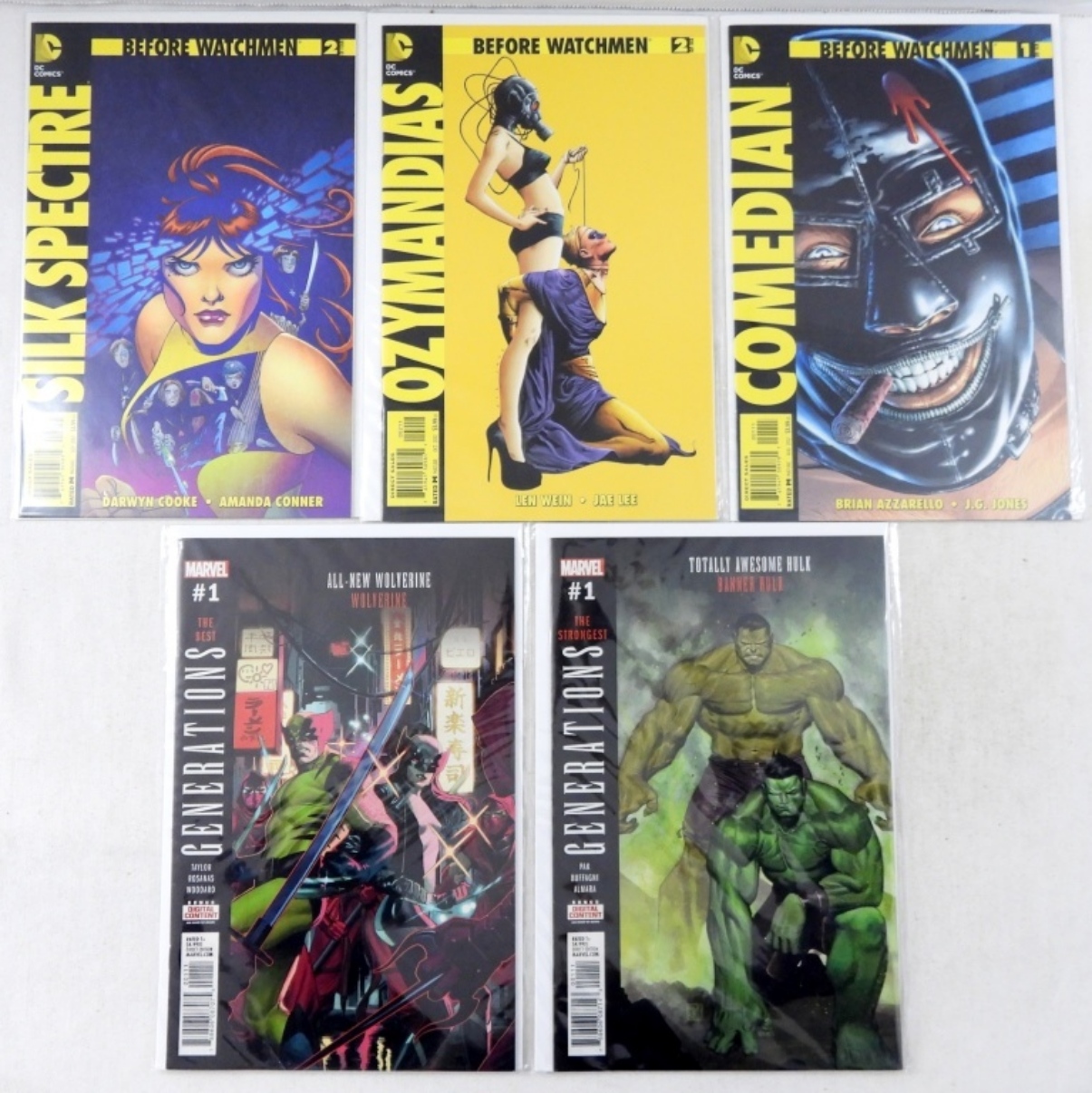 2017 GENERATIONS STEVE RODGERS, BANNER HULK,MS.MARVEL,WOLVERINE,2012 BEOFER WATCHMEN, NITE OWL,SILK SPECTRE, COMEDIANS,OZYMADIAS, VERY FINE CONDITION