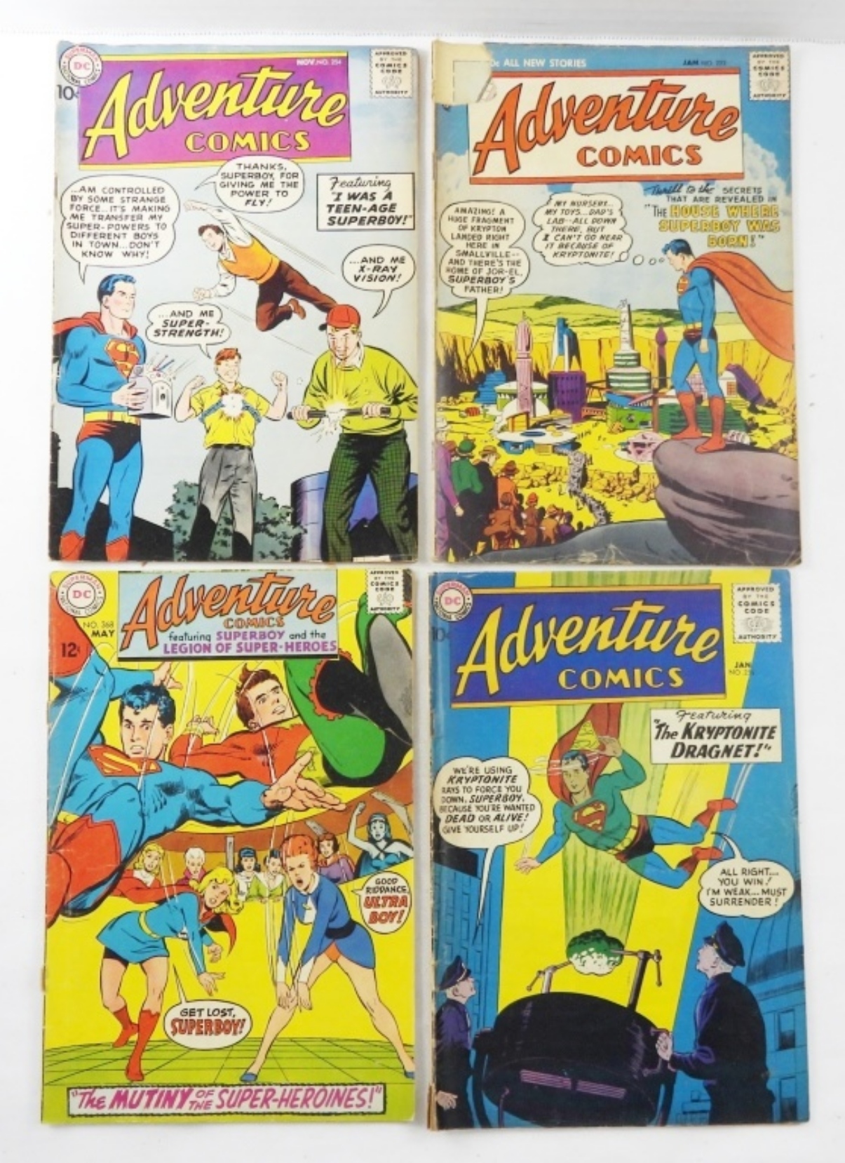 ADVENTURE COMICS #230, 232, 254, 255, 256, 257, 368. GOOD CONDITION, TWO MISSING SMALL CHUNKS OF TITLE PAGE CORNER