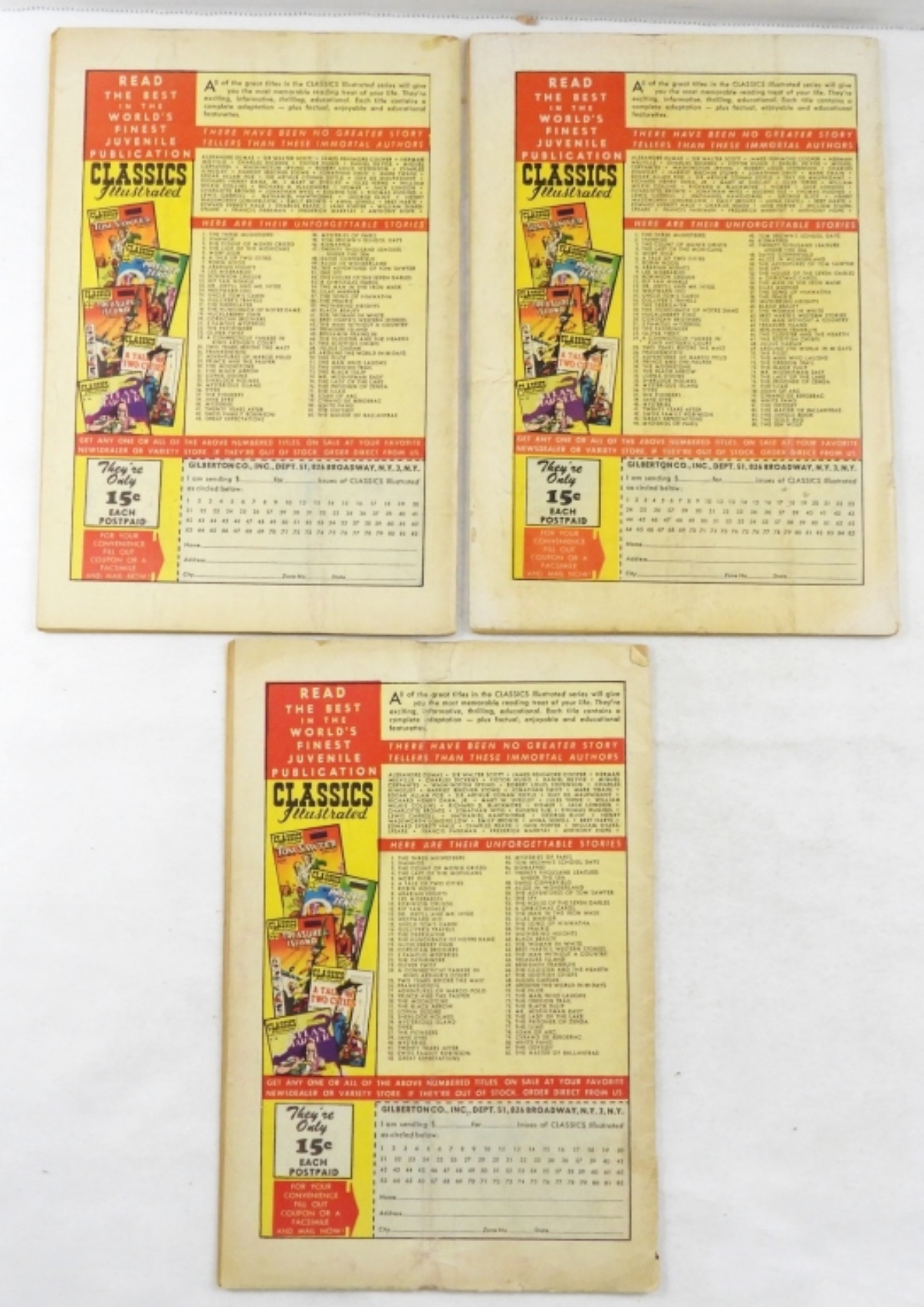 CLASSIC ILLUSTRATED- THE GOLD BUG AND OTHER STORIES # 84 BY EDGAR ALLAN POE, THE MASTER OF BALLANTRAE #82 ROBERT LOUIS STEVENSON, THE ODYSSEY # 81 BY HOMER. ALL COMICS ARE IN FAIR TO GOOD CONDITION.