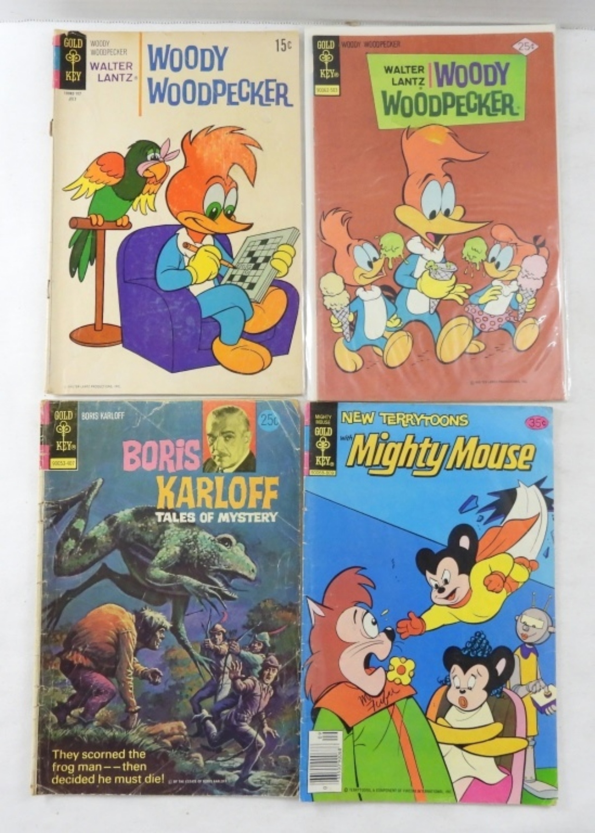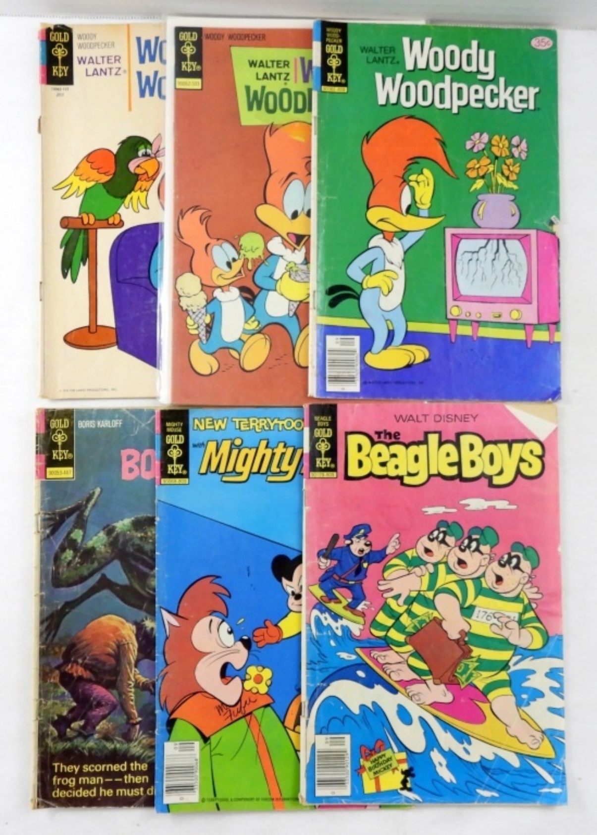 WOODY WOODPECKER #170, 142, 118. THE BEAGLE BOYS #44, MOGHTY MOUSE #52, BORIS KARLOFF TALES OF MYSTERY #55. ALL IN FAIR CONDITION.