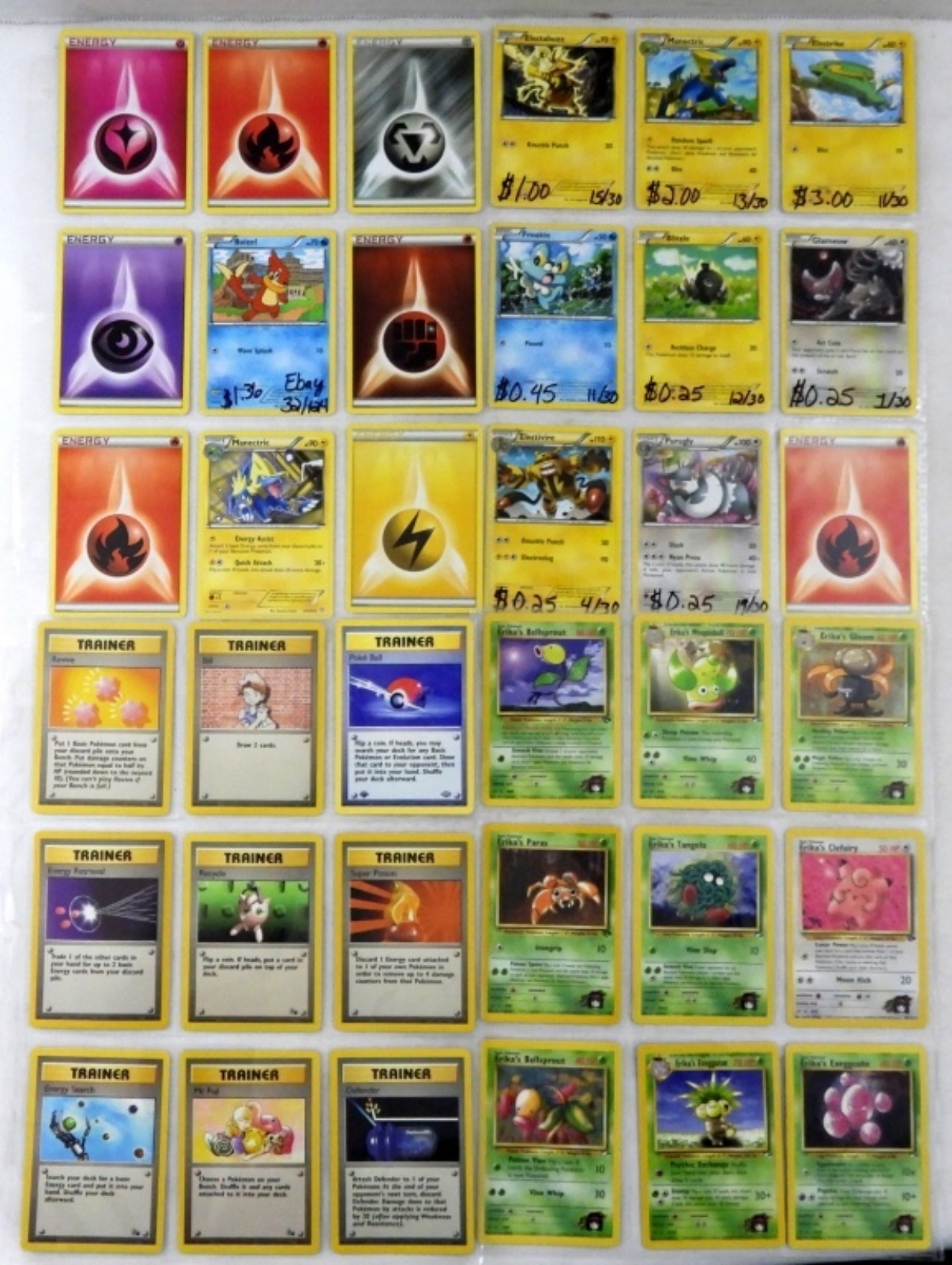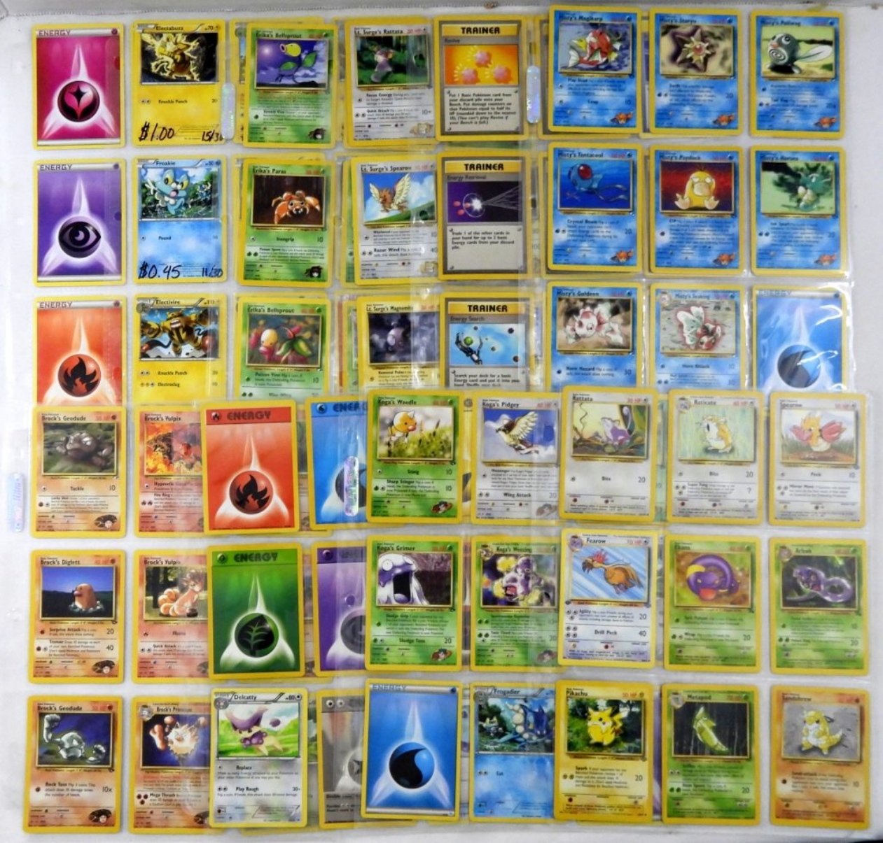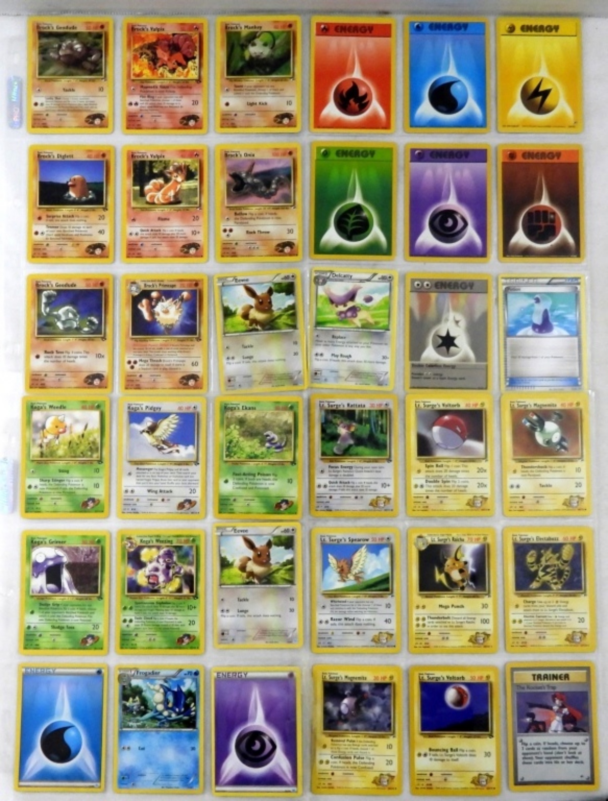 RATTATA 61/102, FROGADIER 6/30, ENERGY CARDS, BROCK’S GEODUDE 38/132. ALL CARDS ARE IN GOOD CONDITION, 10 PAGES. (90 CARDS)