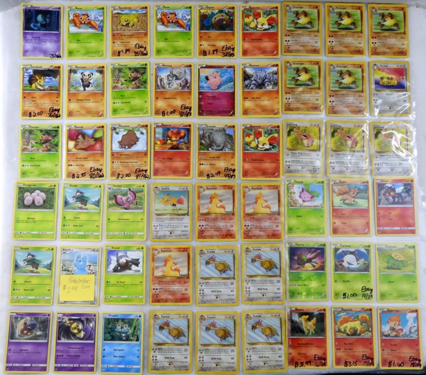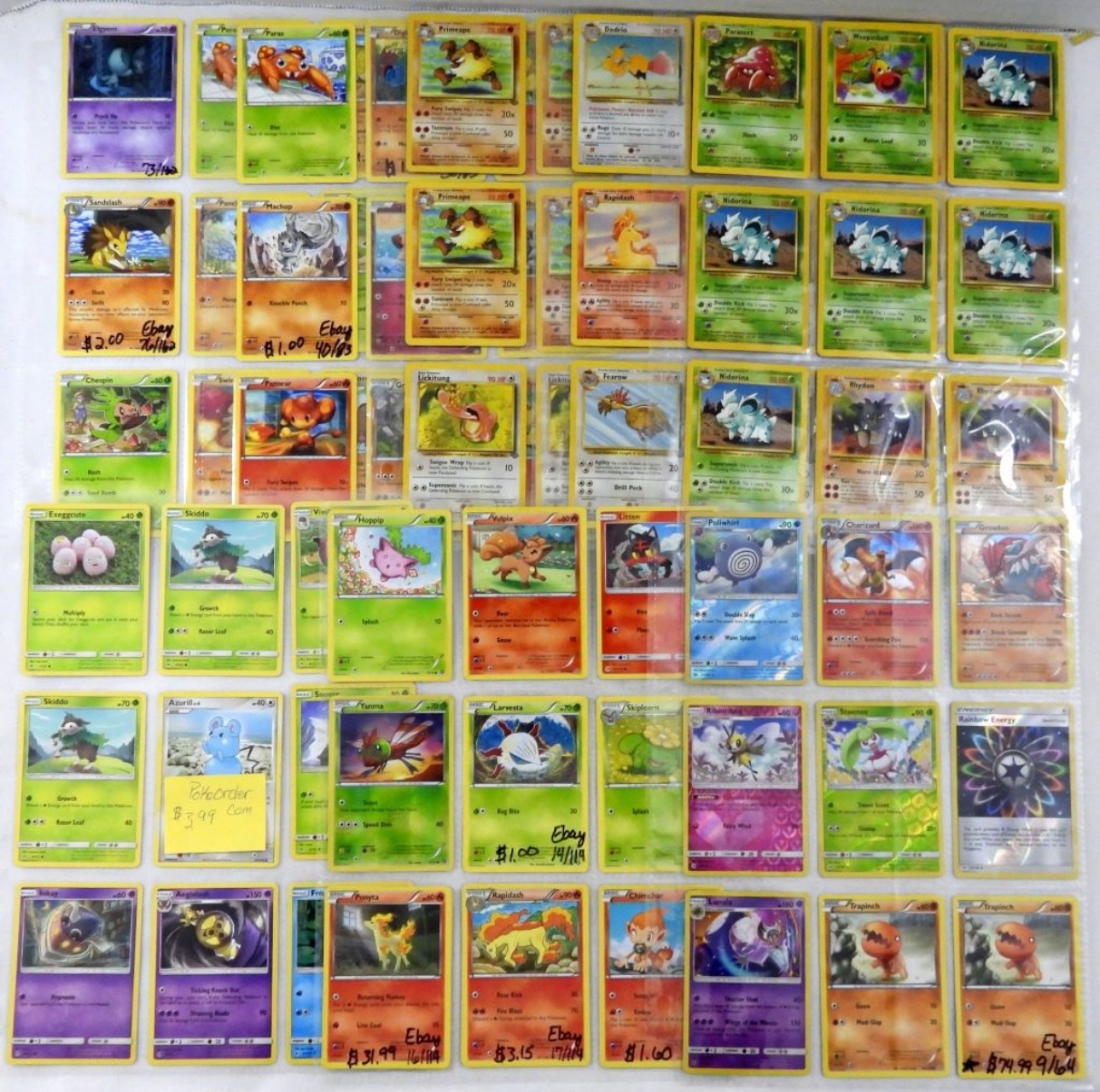 POLIWHIRL 31/149, CHARIZARD 20/149, GROUDON 84/160, RIBOMBEE 93/149, STEENEE 19/149, RAINBOW ENERGY CARD 137/149, LUNALA 61/145. ALL CARDS IN GOOD CONDITION, 8 PAGES.(72 CARDS)