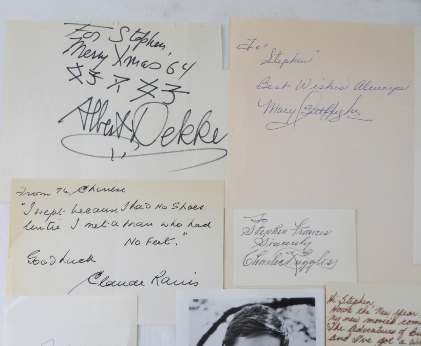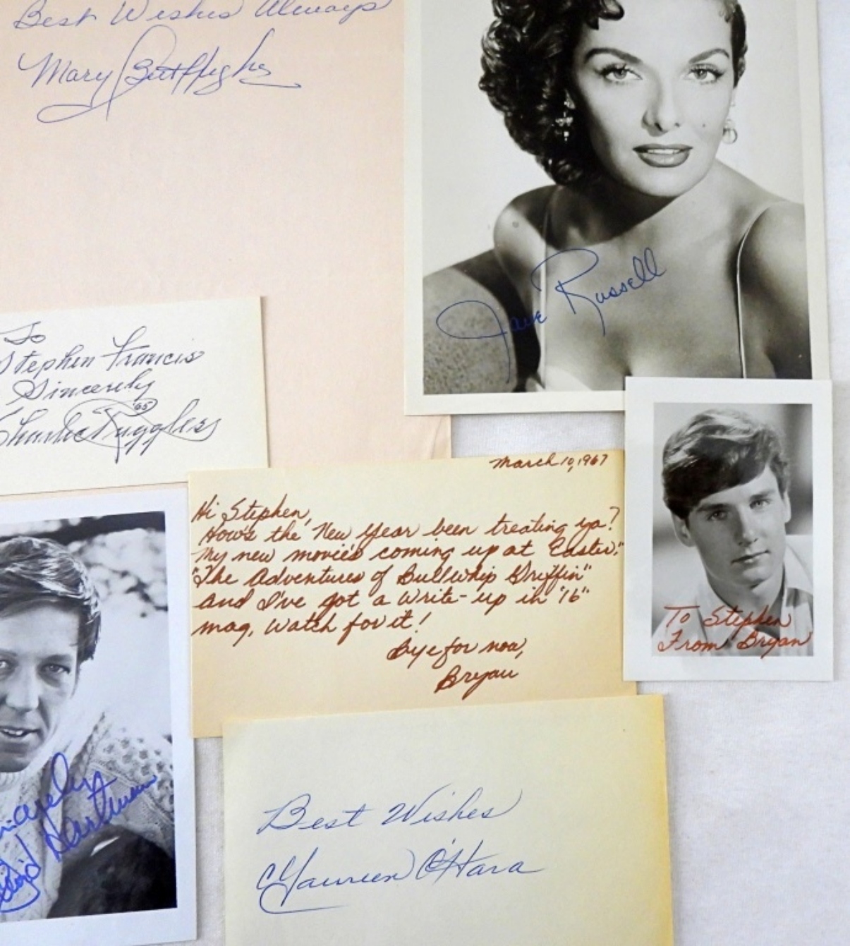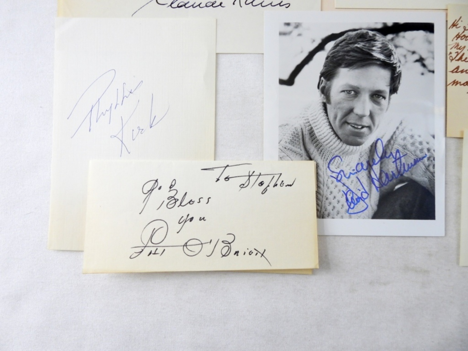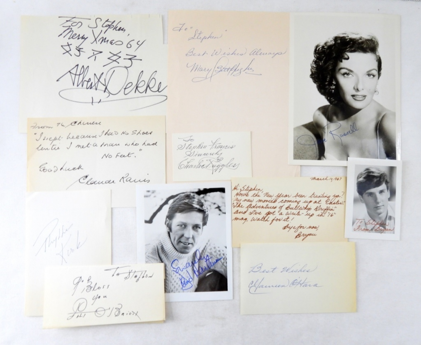 3 AUTOGRAPHED PHOTOS – JANE RUSSELL, DAVID HARTMAN & BRYAN RUSSELL. 7 AUTOGRAPHED NOTES, LETTERS, SCRAPS OF PAPER; PAT O’BRIEN, MAUREEN O’HARA, CLAUDE RAINS, CHARLIE RUGGLES, MARY BETH HUGHES, ALBERT DEKKER,