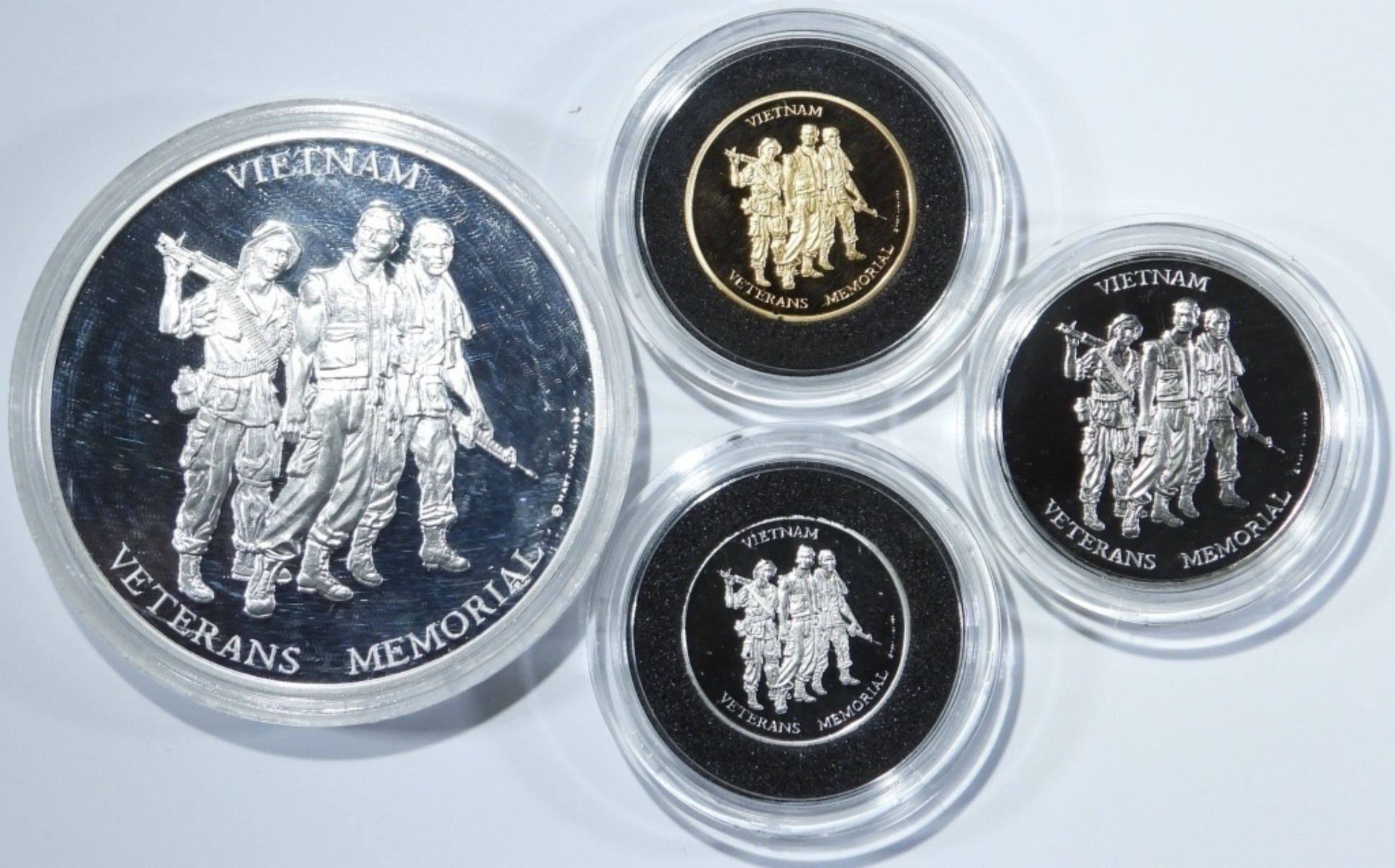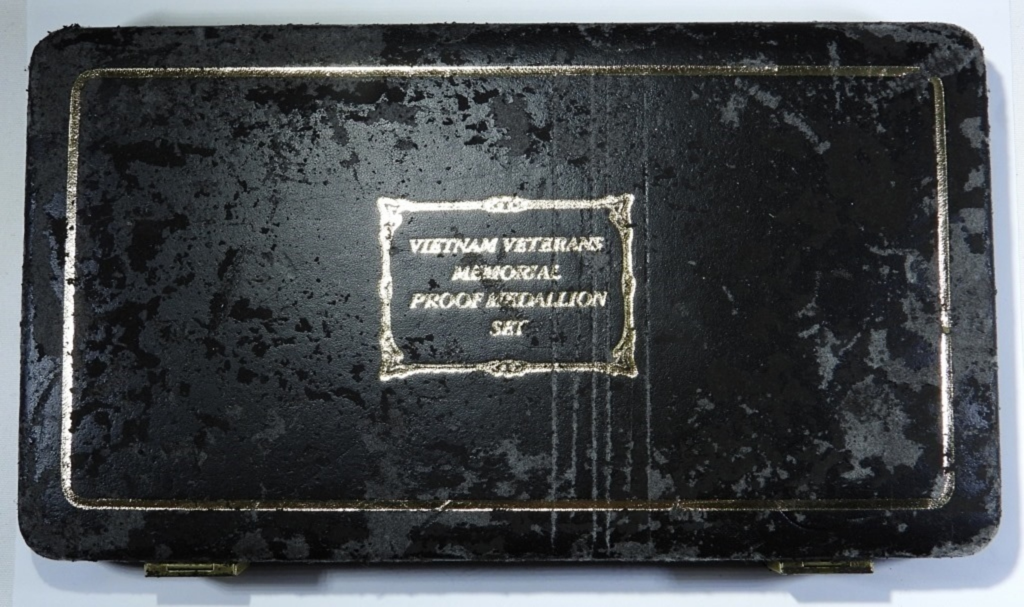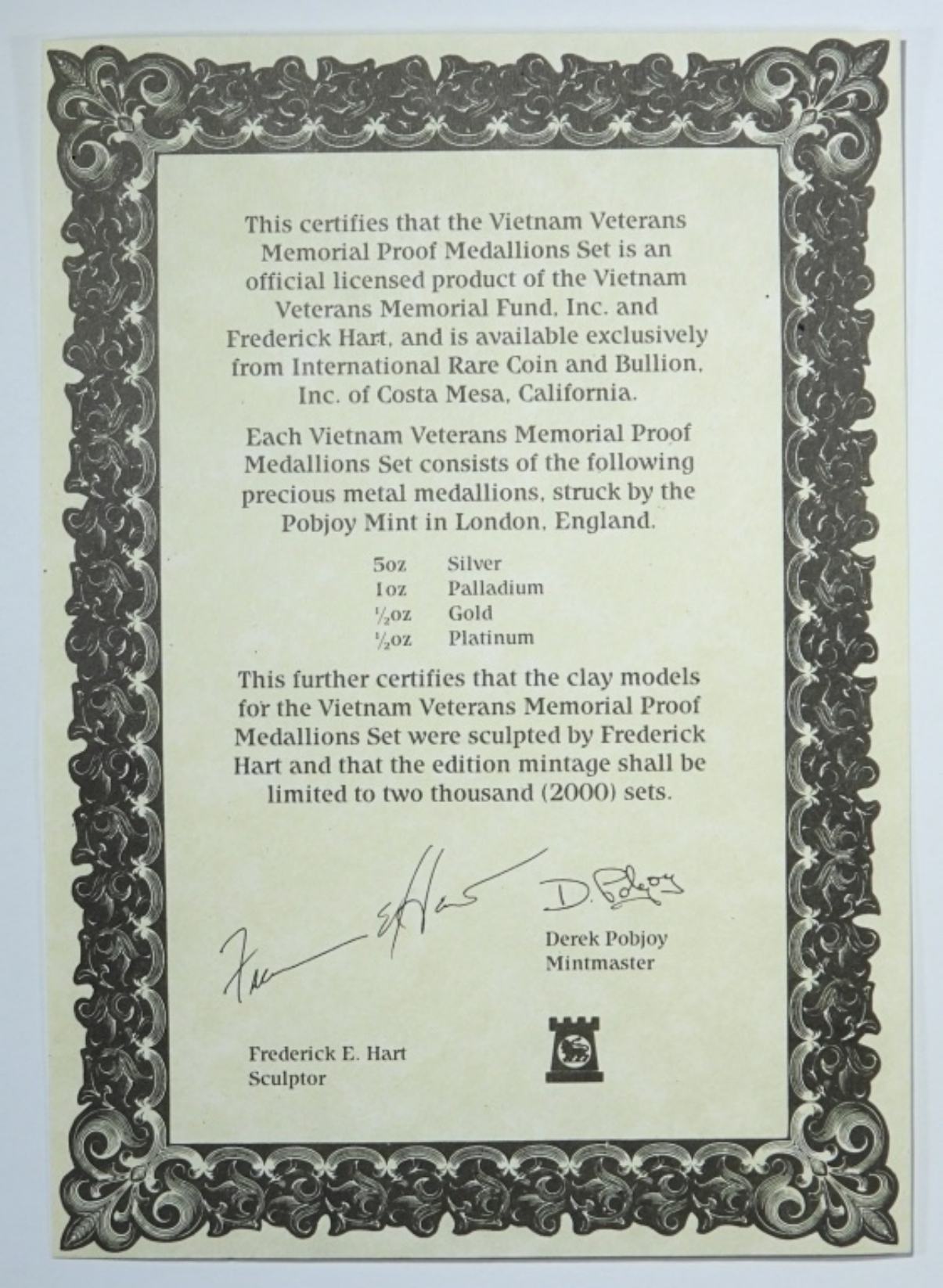 RARE 1984 POBJOY MINT 4-COIN VIETNAM VETERANS MEMORIAL PROOF MEDALLION SET. INCLUDES 5oz SILVER, 1oz PALLADIUM, 1/2oz GOLD & 1/2oz PLATINUM. IN ORIGINAL DISPLAY CASE, WITH COA. OUTSIDE OF CASE DAMAGED/DETERIORATING.