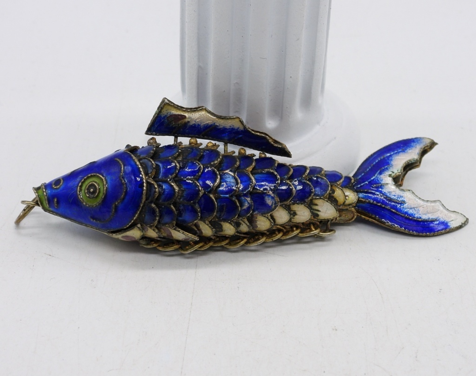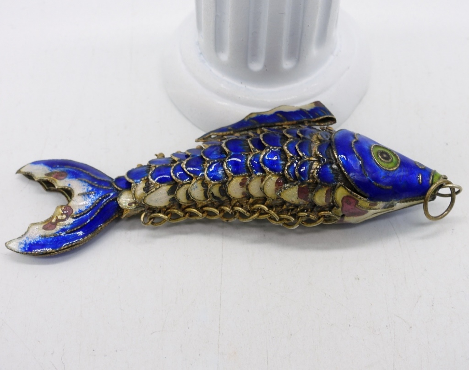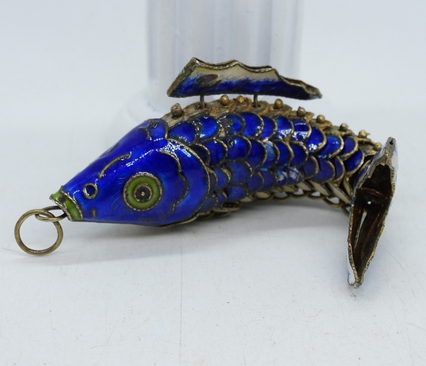 CLOISONNE ARTICULATED KOI FISH PENDANT, BLUE. 4″.