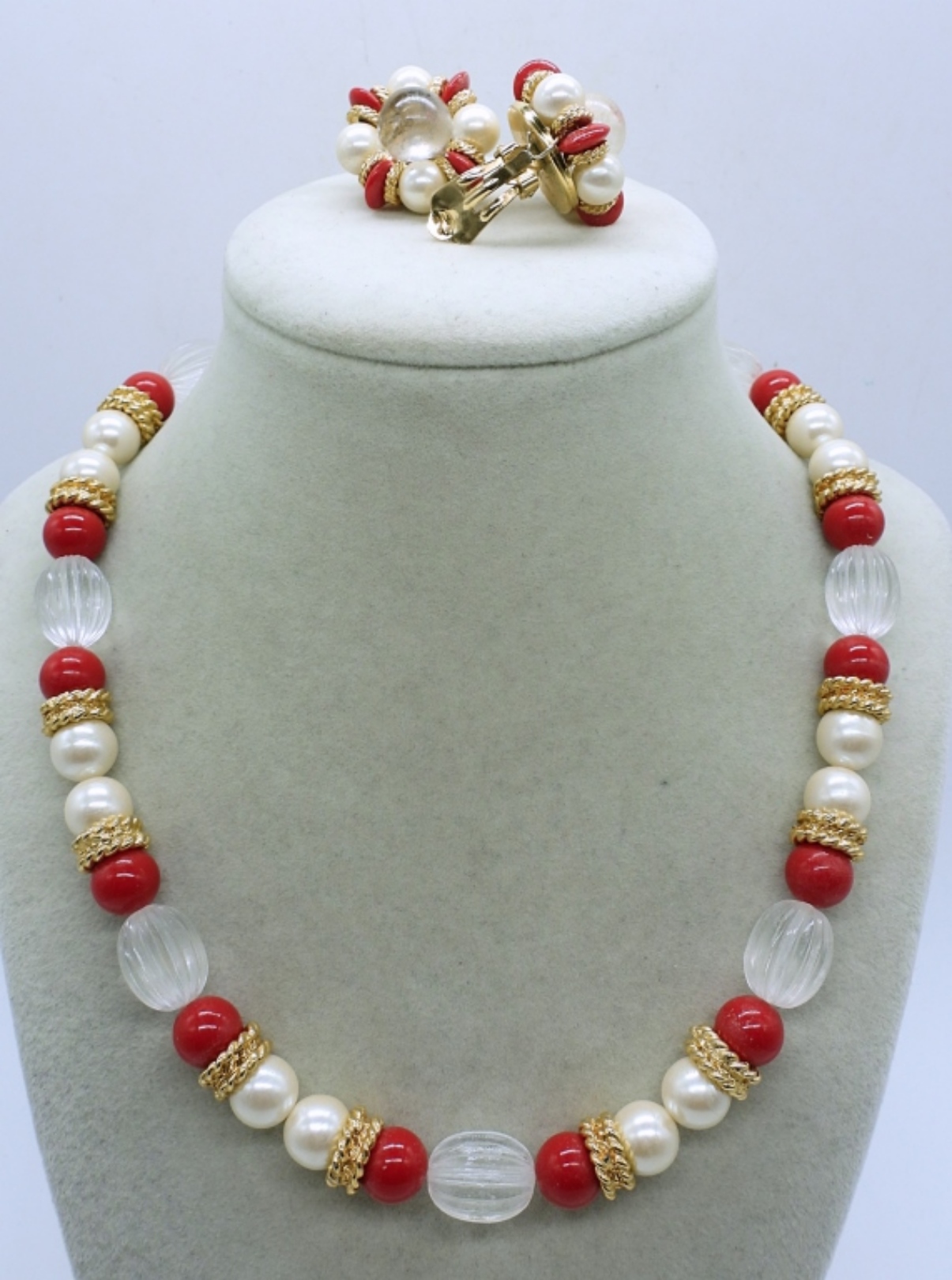 VINTAGE RED AND WHITE GOLD TONE NECKLACE, 18″. CLIP ON EARRINGS