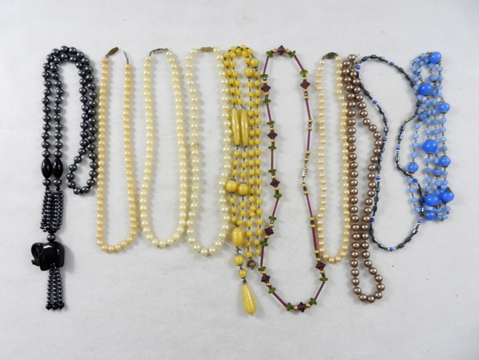 10 BEADED NECKLACES ALL IN GOOD CONDITION. BLUE BEADED NECKLACE, PEARL NECKLACE, YELLOW BEADED NECKLACE. LENGTHS RANGE FROM 12″-24″.