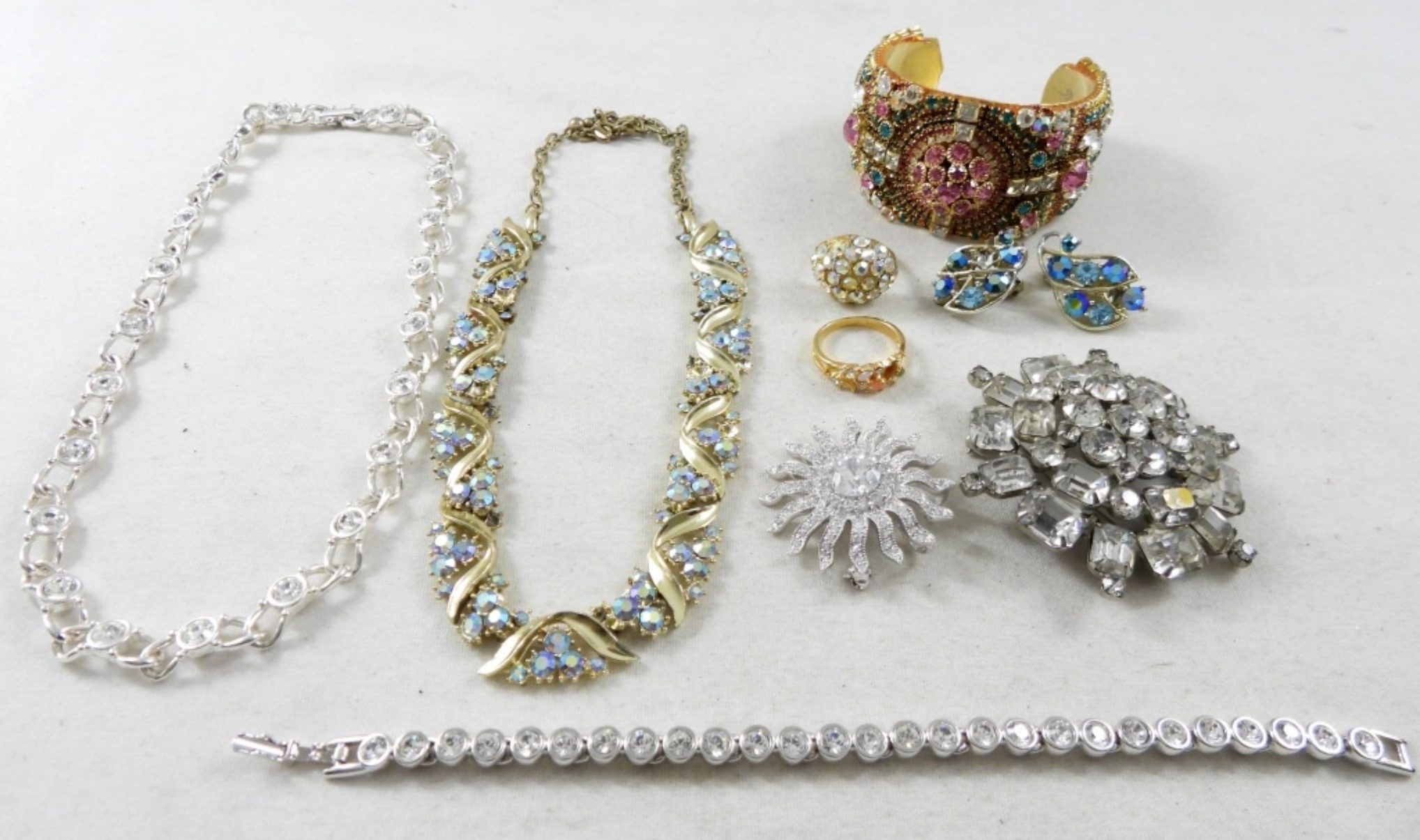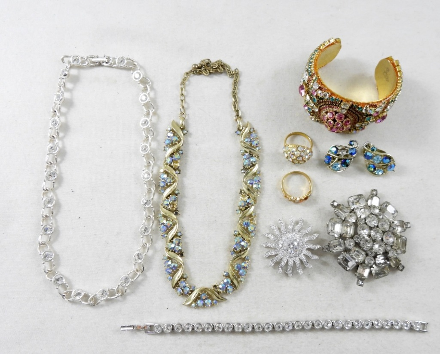 MULTICOLOR RHINESTONE CUFF BRACELET, BLUE RHINESTONE EARRING PAIR WITH CLIP-ON STYLE BACKS (MISSING ONE RHINESTONE), 14″ RHINSTONE NECKLACES (MISSING SOME RHINESTONES IN ), CLEAR RHINESTONE BRACELET, 2 RHINESTONE