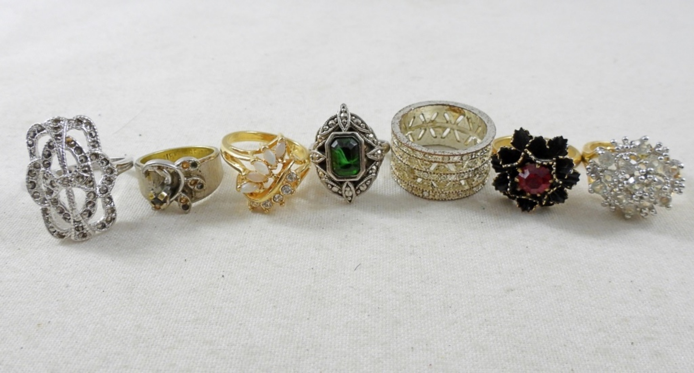 12 VINTAGE RINGS LOT, SIZES RANGE FROM 5-12. GOLD & SILVER TONES WITH RHINESTONES. ALL IN GOOD CONDITION.