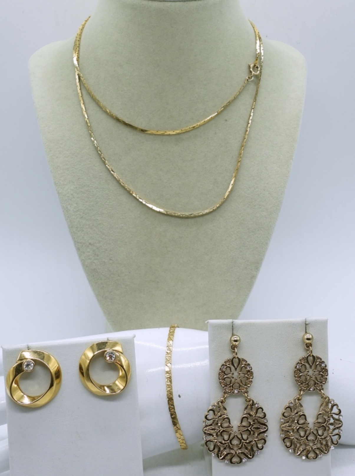 4 PIECE LADIES GOLD TONE SET,30″ GOLD TONE NECKLACE ,3″ GOLD TONE BRACELET AND 2 PAIR OF EARRINGS