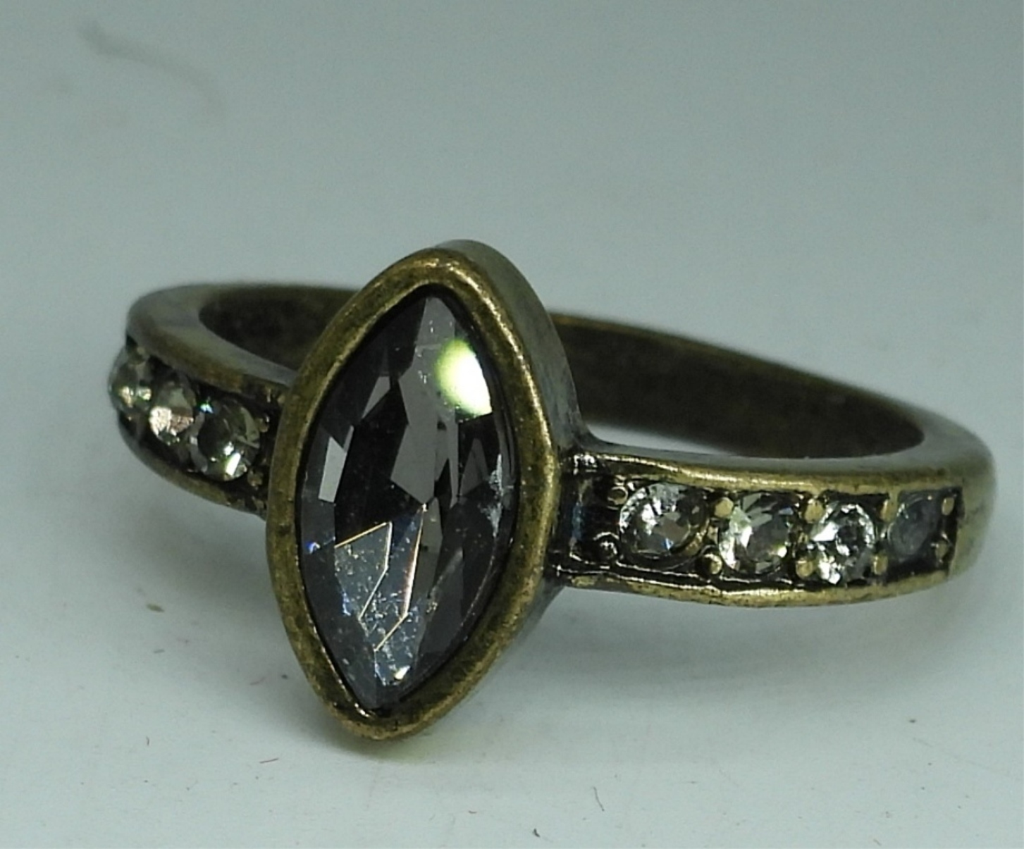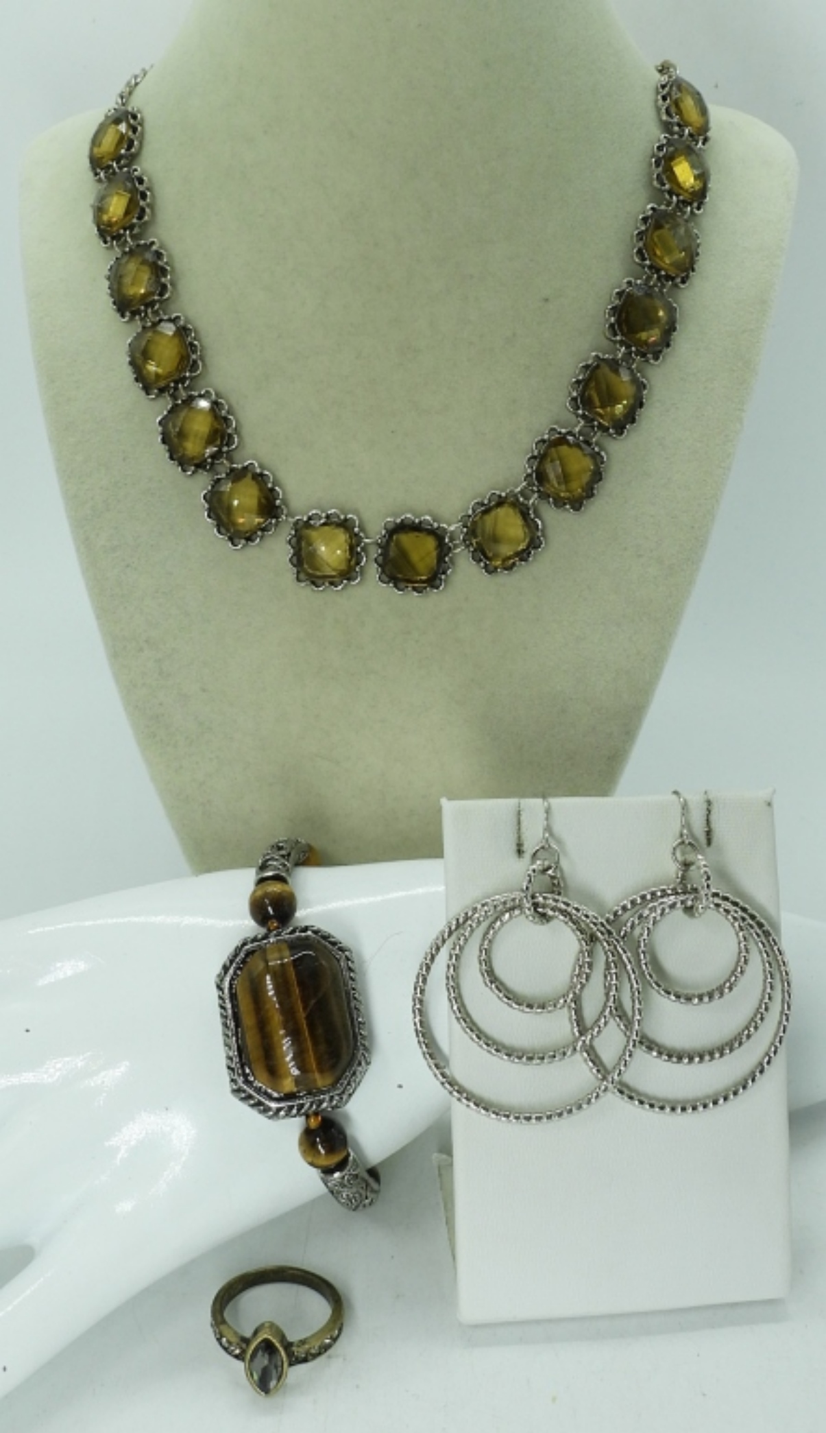 4 PIECE FASHION JEWELRY SET,18″ SILVER TONE NECKLACE WITH YELLOW / BROWN GENSTONES, A 3″ SILVER TONE BRACELET WITH A BROWN GEMSTONE, A PAIR OF EARRINGS AND A RING SIZE 8