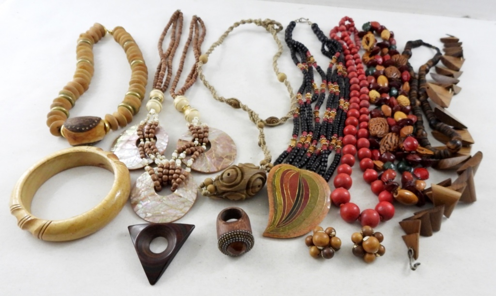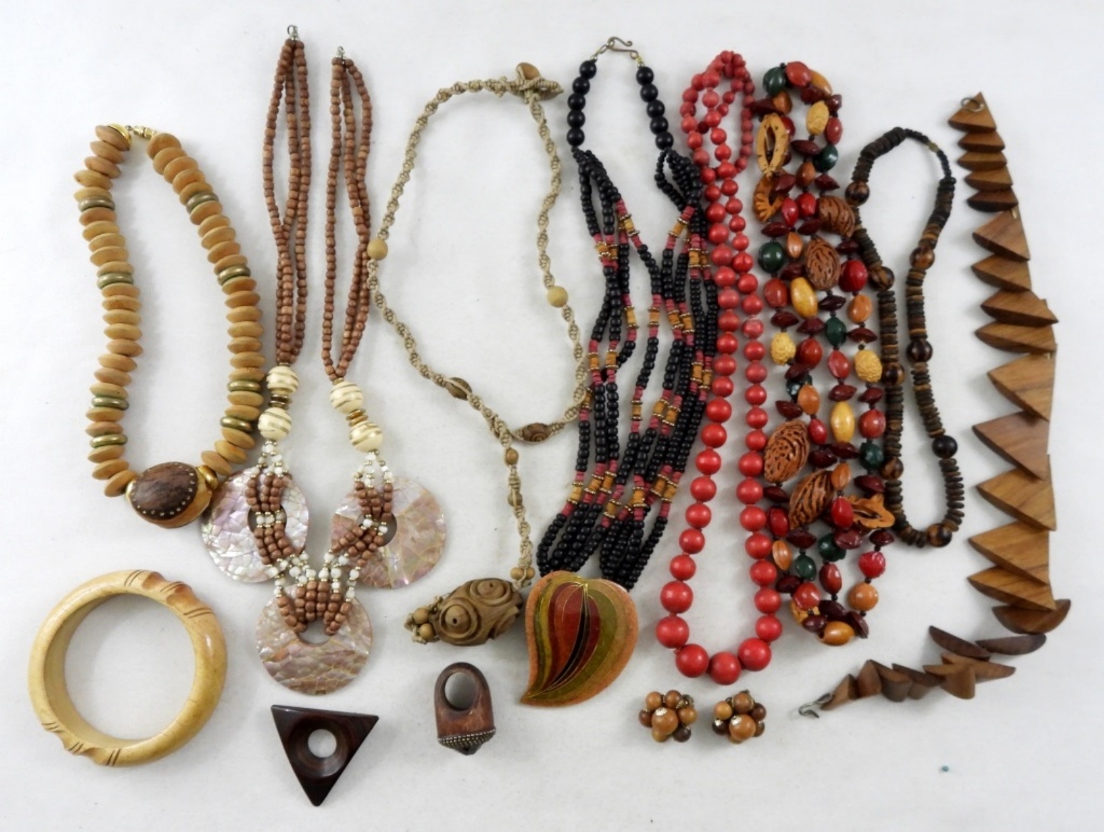 8 ASSORTED NECKLACES, 1 WOODEN BROOCH, 1 WOODEN RING (SIZE: 5.5/6), 1 PAIR OF WOODEN EARRINGS