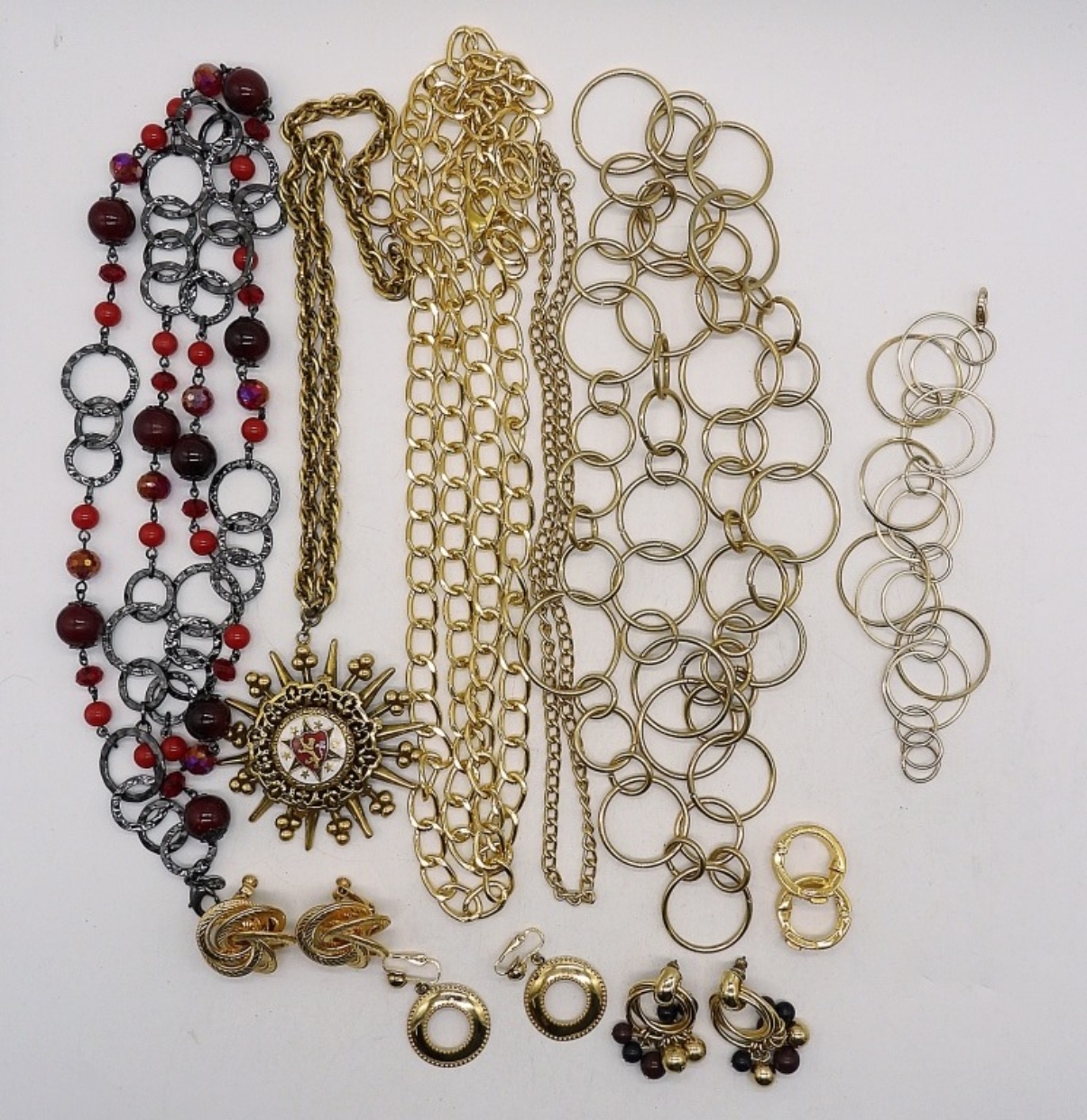 5 GOLD & BLACK TONED NECKLACES, 18-40″. ONE BRACELET, 8″. 4 PAIR OF EARRINGS, PIERCED & SCREW BACK.