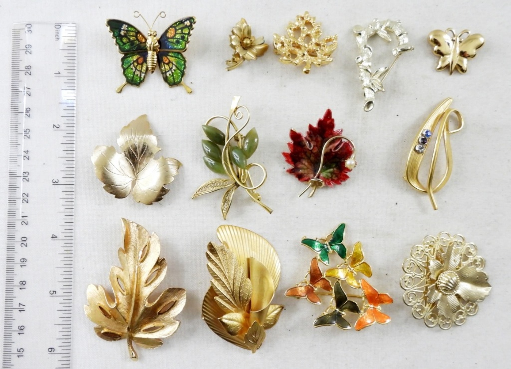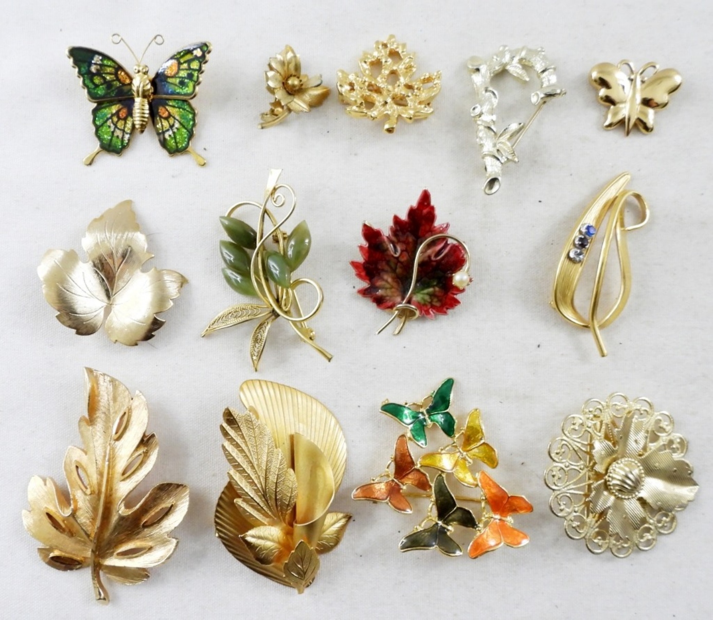 13 ASSORTED BROOCHES, LEAF MOTIFS, BID NOW!