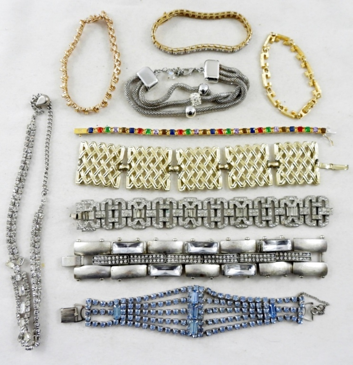 9 BRACELETS, 1 NECKLACE, RHINESTONE AND DIAMOND LIKE STYLE, BOTH GOLD AND SILVER TONES WITH SOME COLORED GEMSTONES
