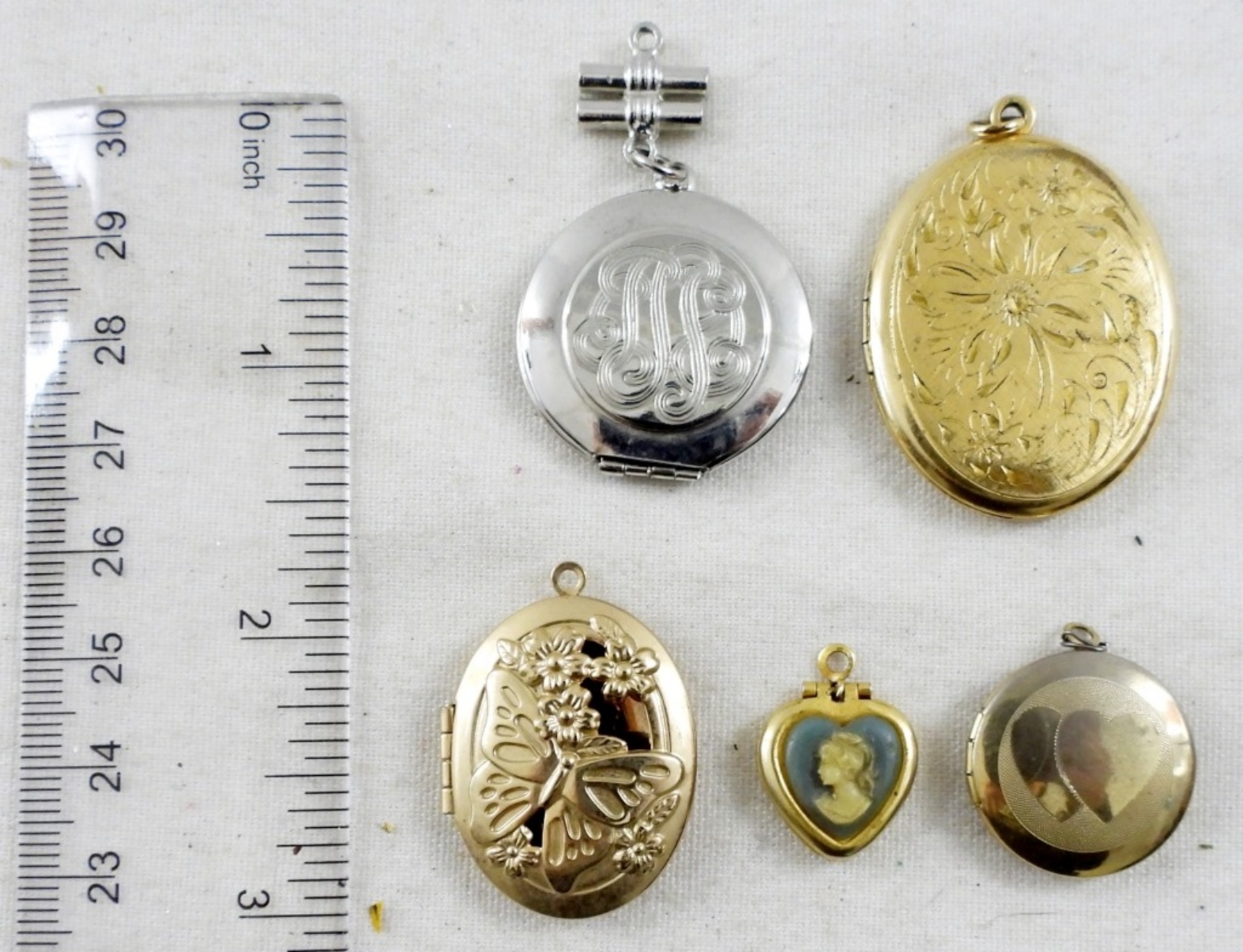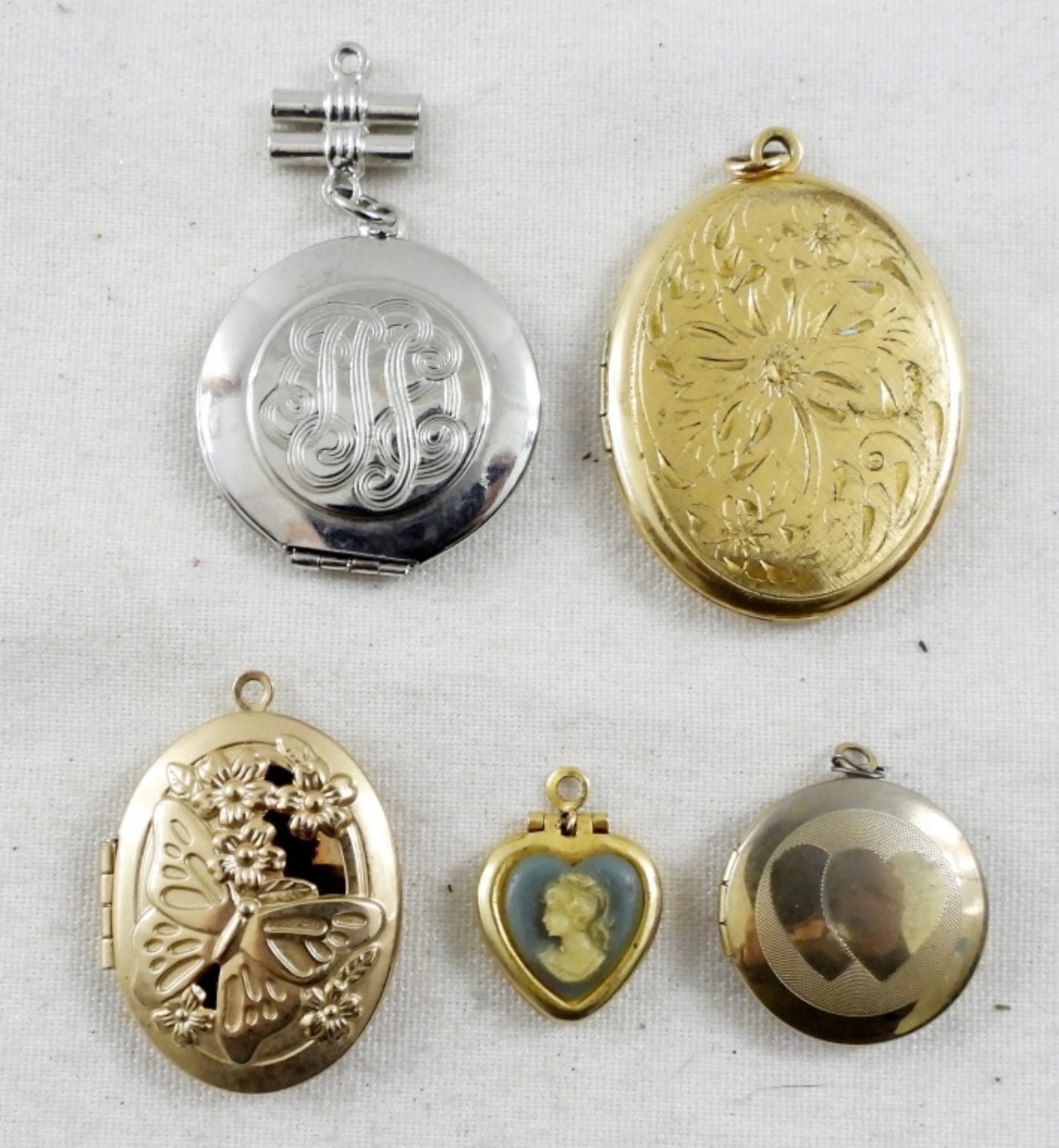 5 MINI-SMALL SIZED LOCKETS, ALL DIFFERENT DESIGNS