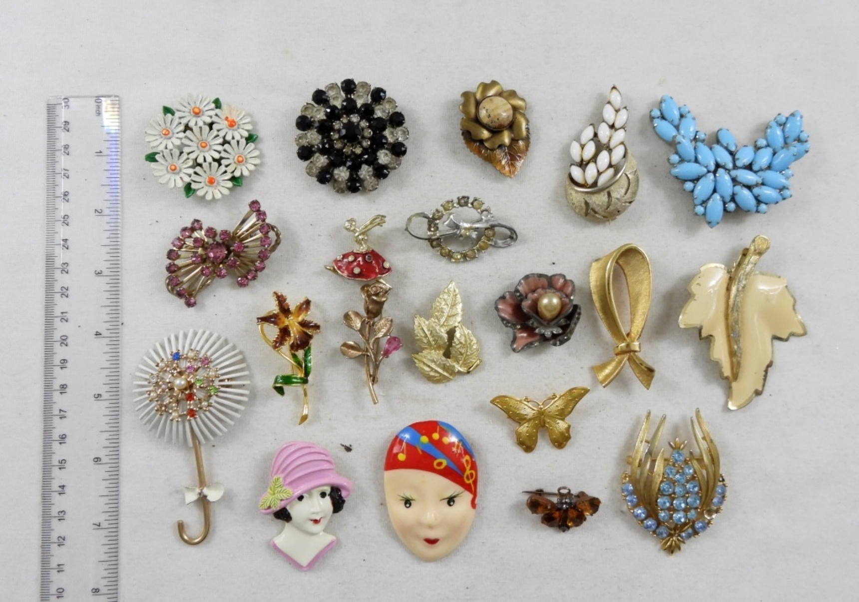 20 ASSORTED FUN BROOCHES: INCLUDING FLOWERS, FACES, BUTTERFLY, GEMSTONES