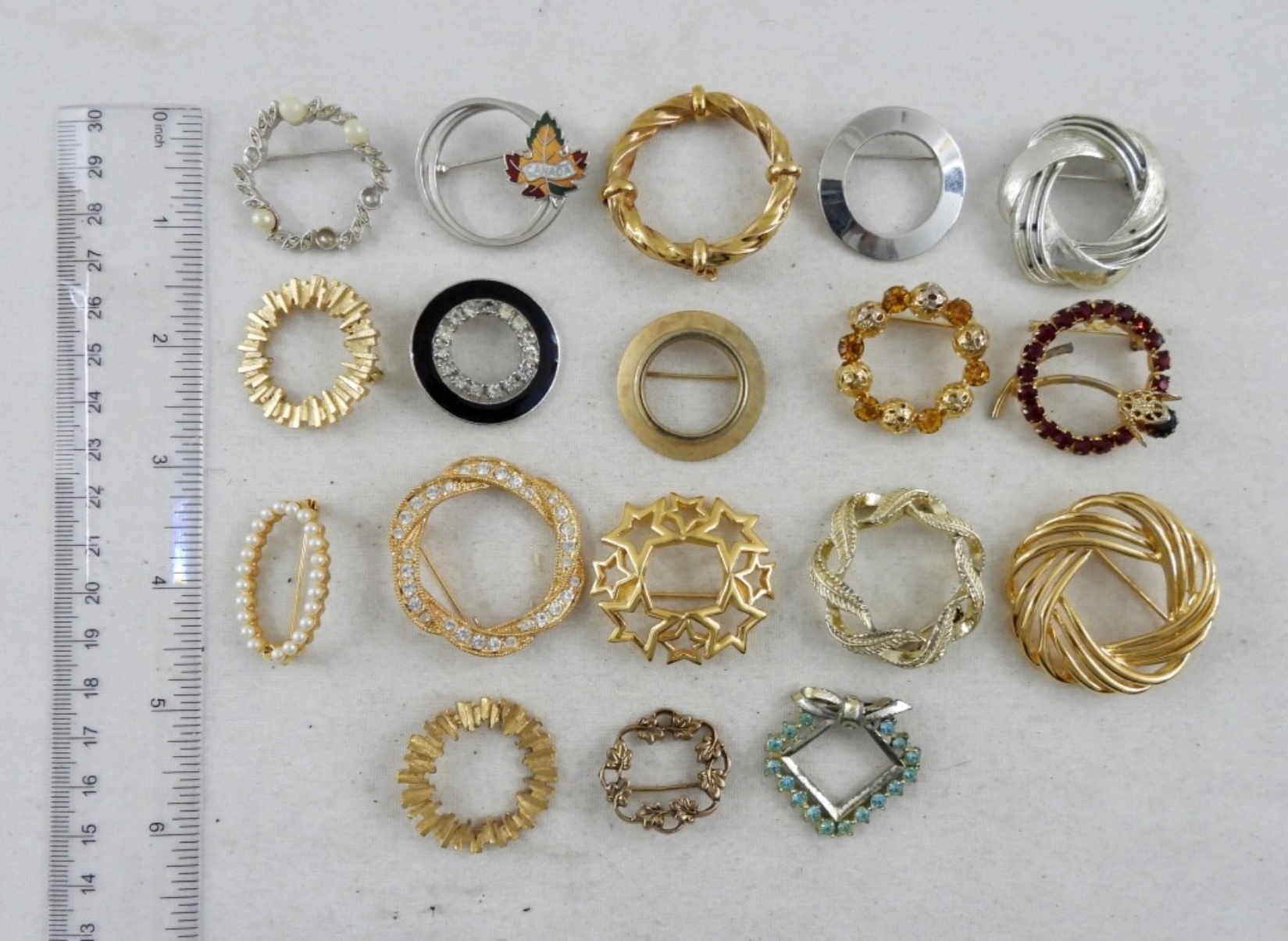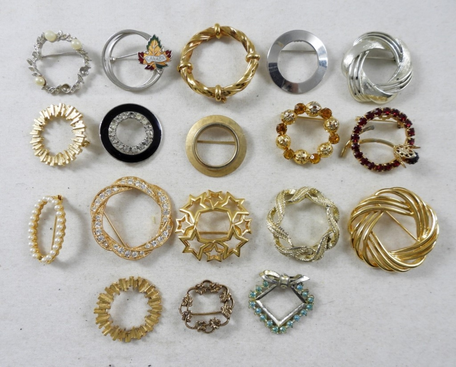 ASSORTED 18 VINTAGE CIRCLE SCARF PINS OR BROOCHES