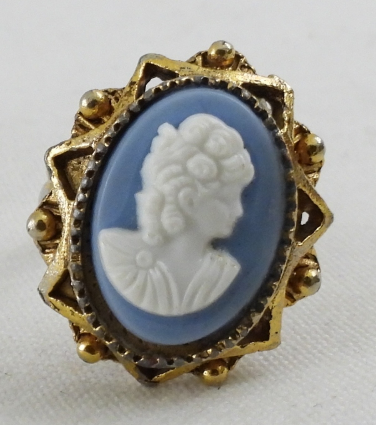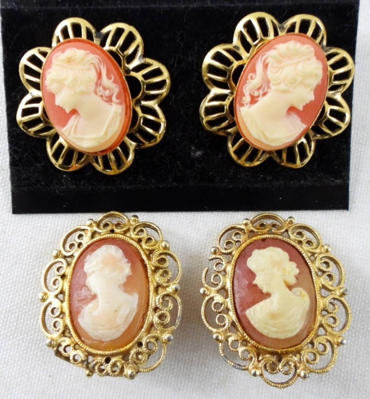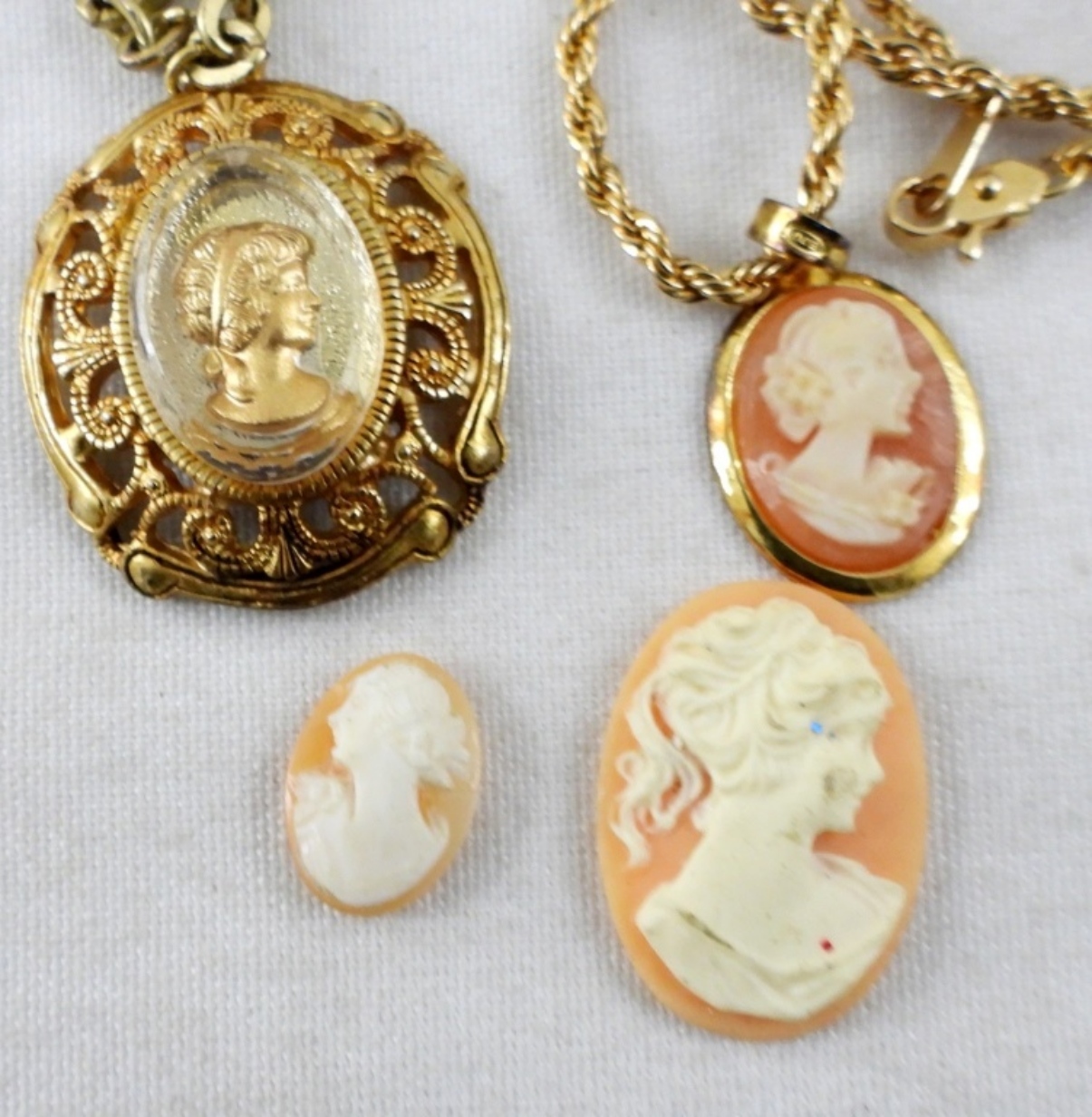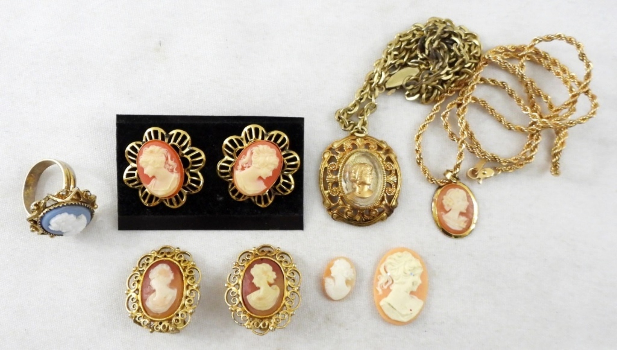 2 CAMEO PENDANTS ON CHAINS, 1 RING (SIZE6.5), 2 PAIRS OF EARRINGS, ADDITIONAL 2 CAMEO DESIGNS NOT ATTACHED TO JEWELRY