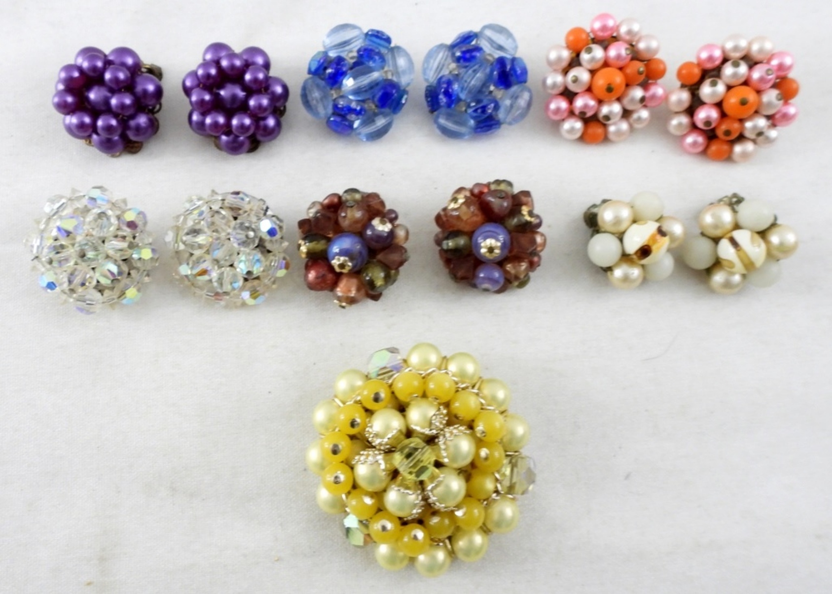 6 VINTAGE CLIP ON BEADED EARRINGS (VARIOUS COLORS), AND 1 VINTAGE BEADED BROOCH