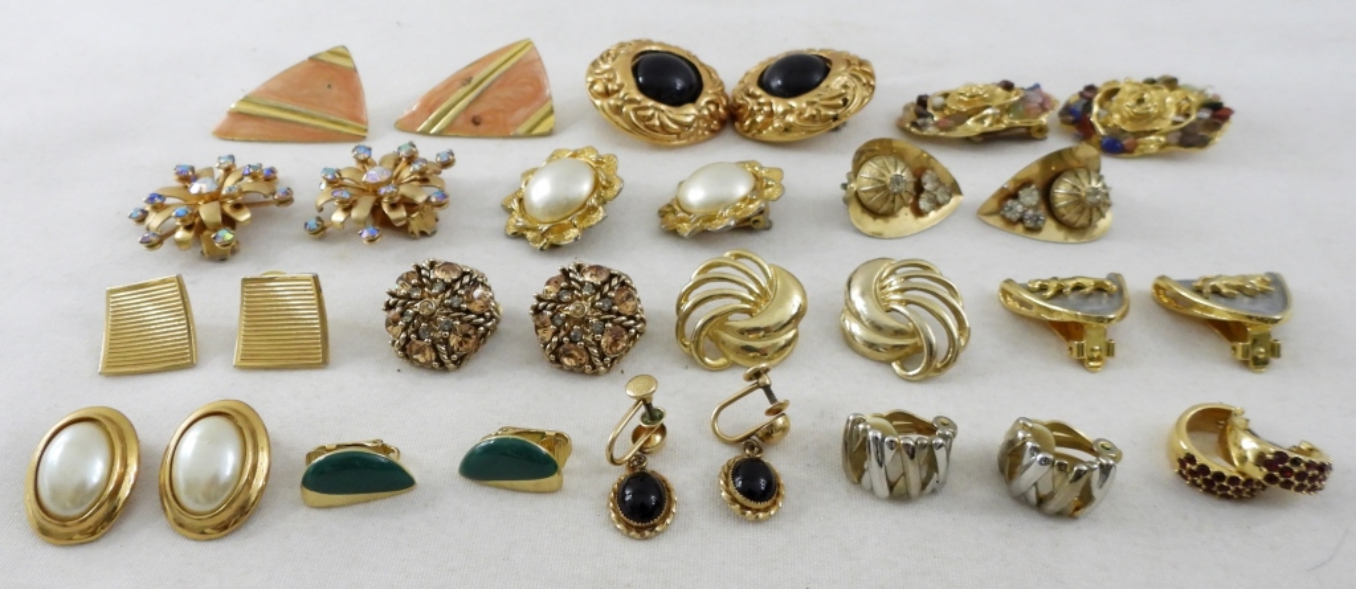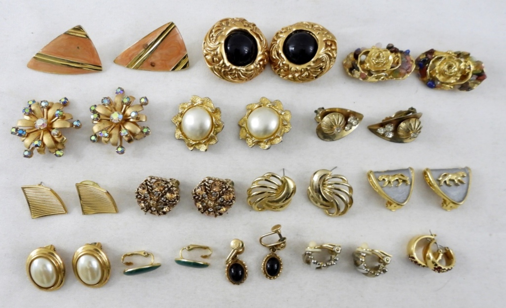 15 PAIRS OF EARRINGS, MOSTLY IN GOLD TONE STYLES WITH VARIOUS ACCENT COLORS, BID NOW!