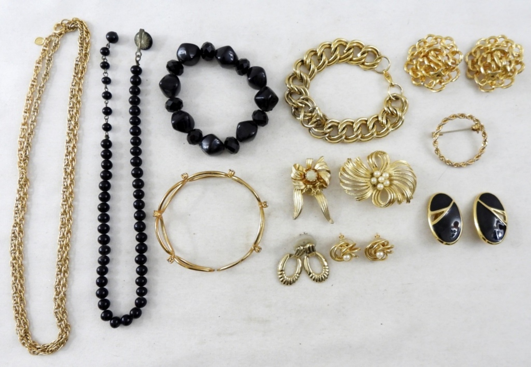 3 PIN BROOCHES, 4 PAIRS OF EARRINGS, 3 BRACELETS, 2 NECKLACES LENGTH: 14 AND 32 IN