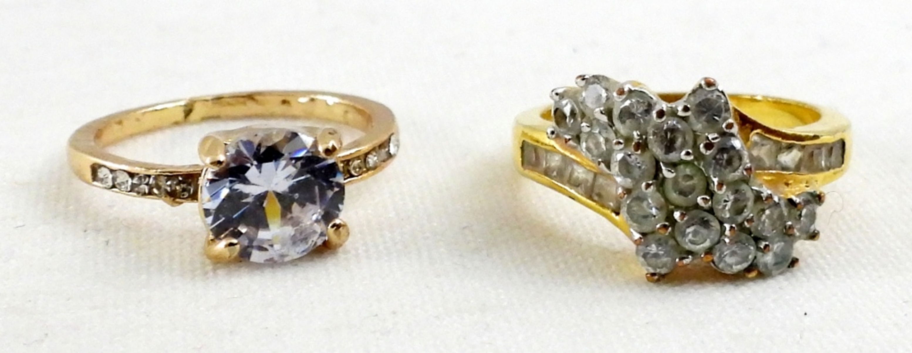 2 RINGS (SIZE 6 AND 7), 2 DIAMOND LIKE BRACELETS, 2 NECKLACES, AND 1 GOLD TONE NECKLACE AND BRACELET SET