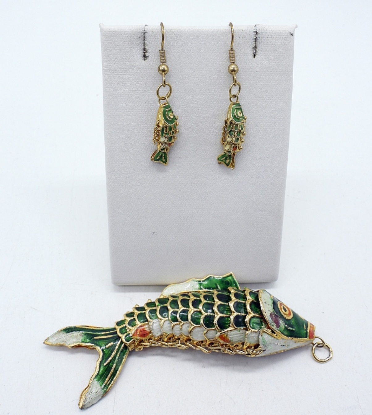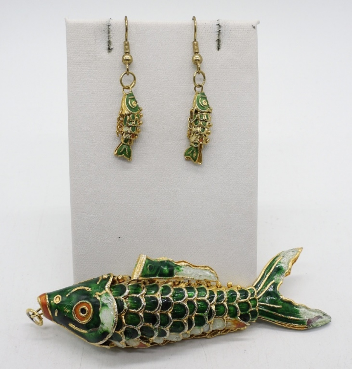 CLOISONNE ARTICULATED KOI FISH PENDANT, GREEN. 4″.