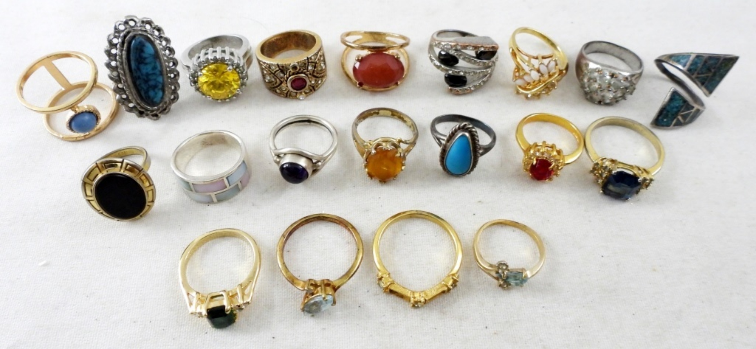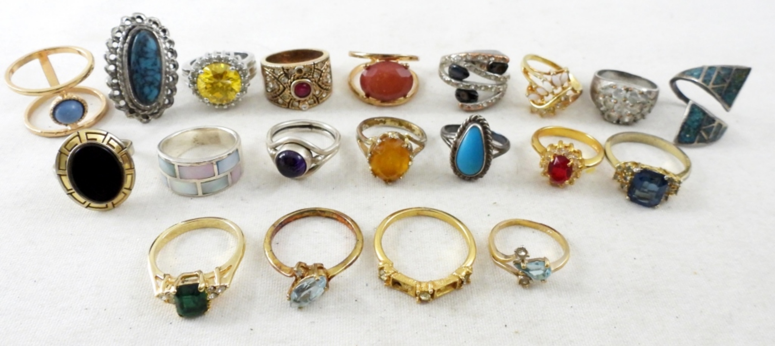 20 ASSORTED RINGS IN VARIOUS STYLES AND COLORED GEMSTONES, SIZES: 6-10
