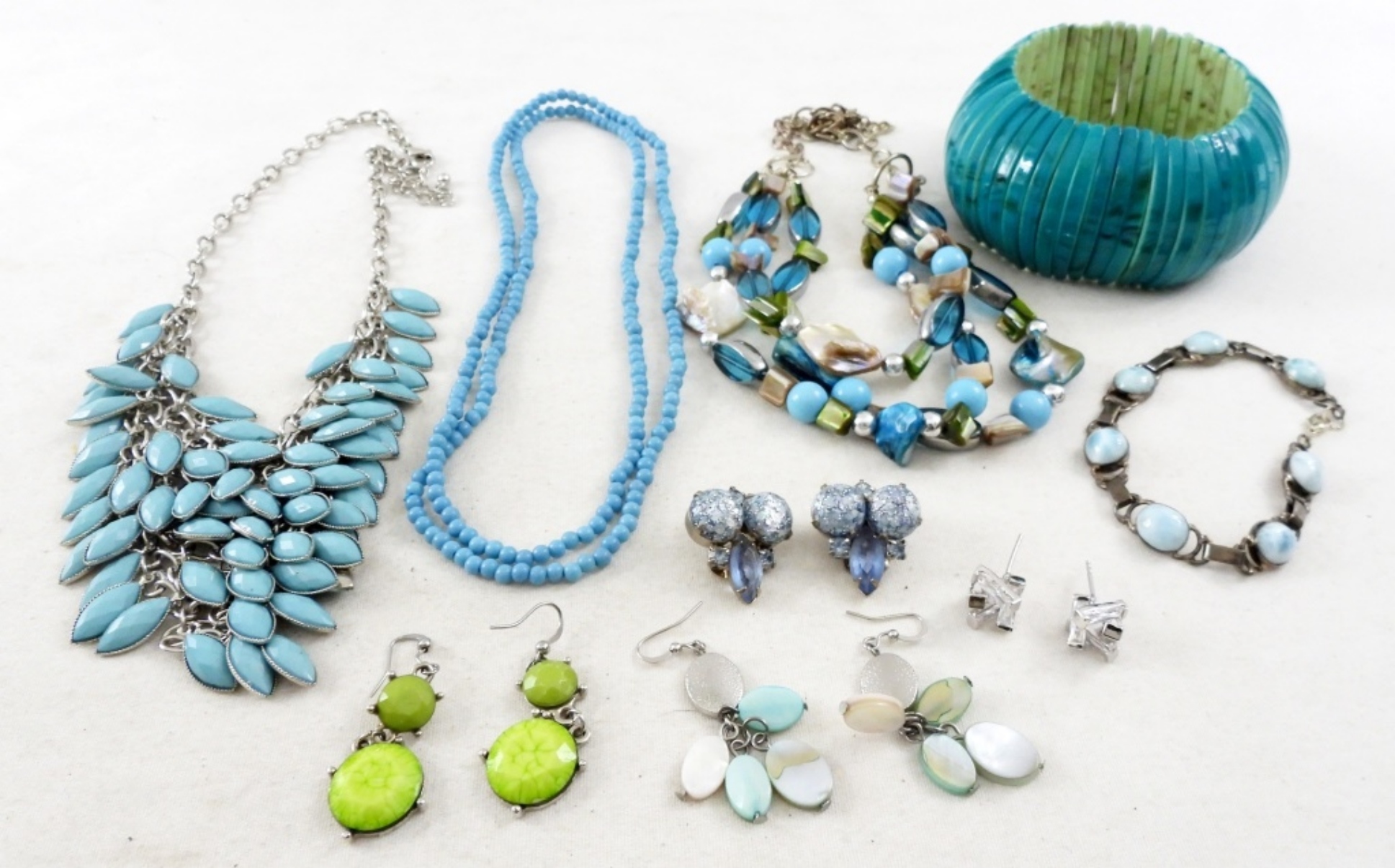 EARRINGS, BRACELETS, NECKLACES IN VARIOUS BLUE SHADES