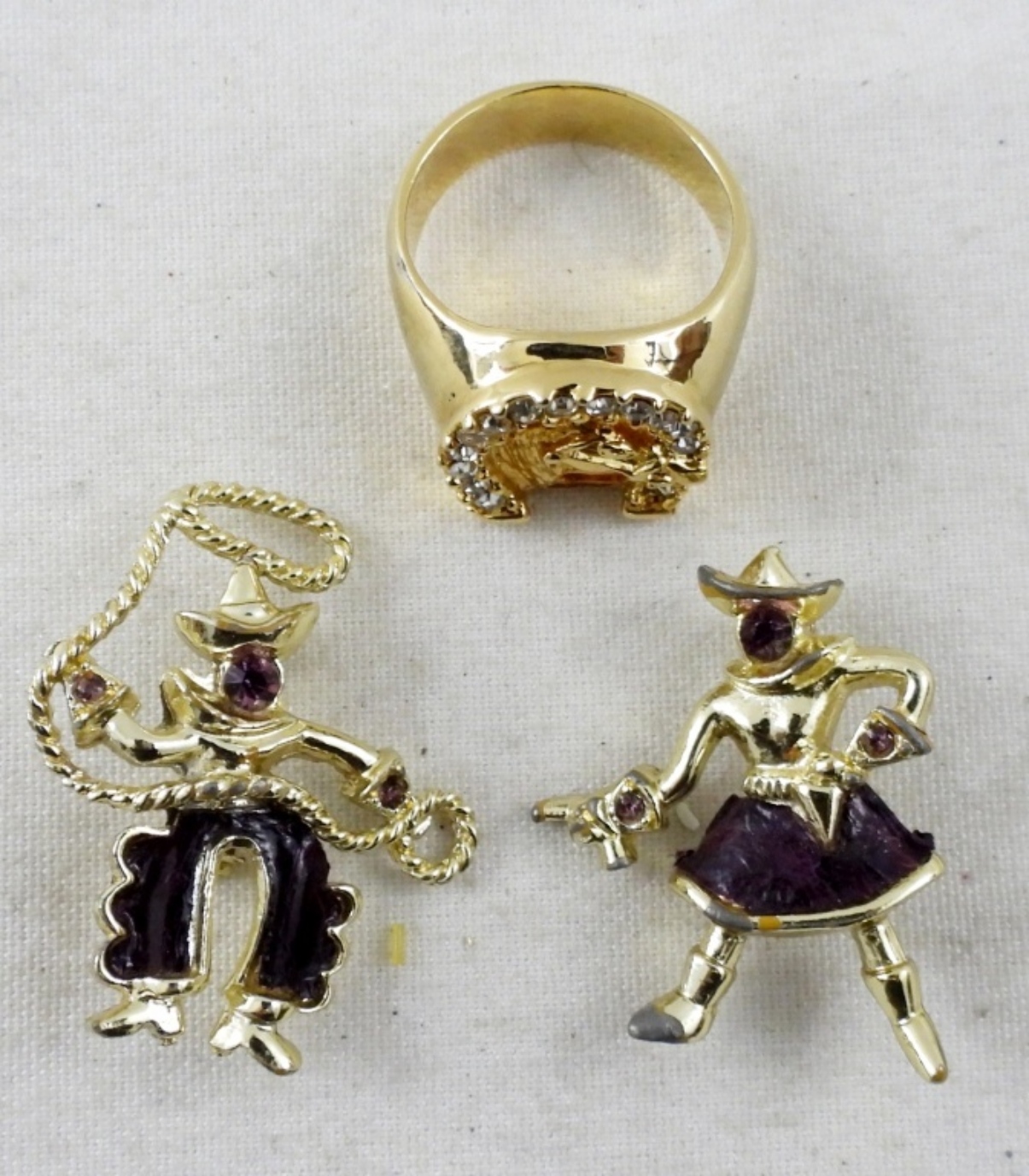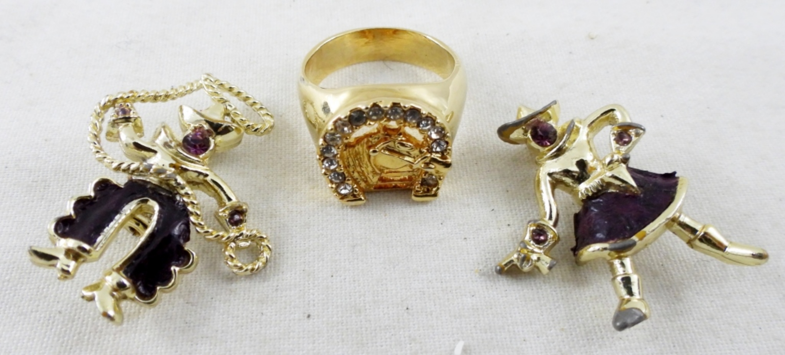 2 VINTAGE COSTUME COWBOY BROOCHES AND 1 HORSE/HORSESHOE RING SIZE: 12
