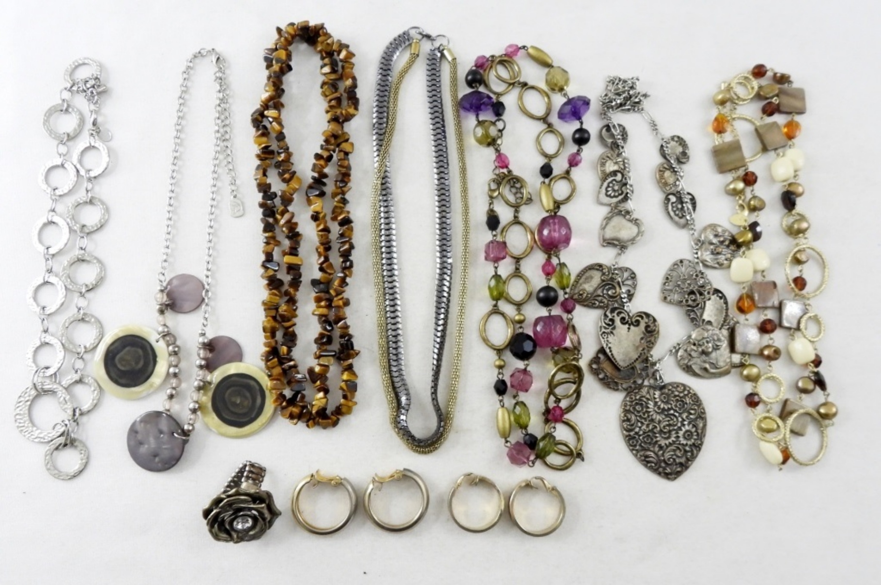 2 PAIRS OF EARRINGS, 1 FLOWER BROOCH, 7 NECKLACES