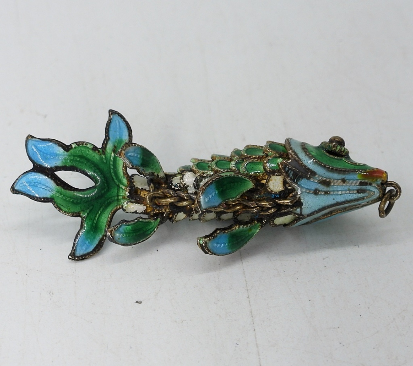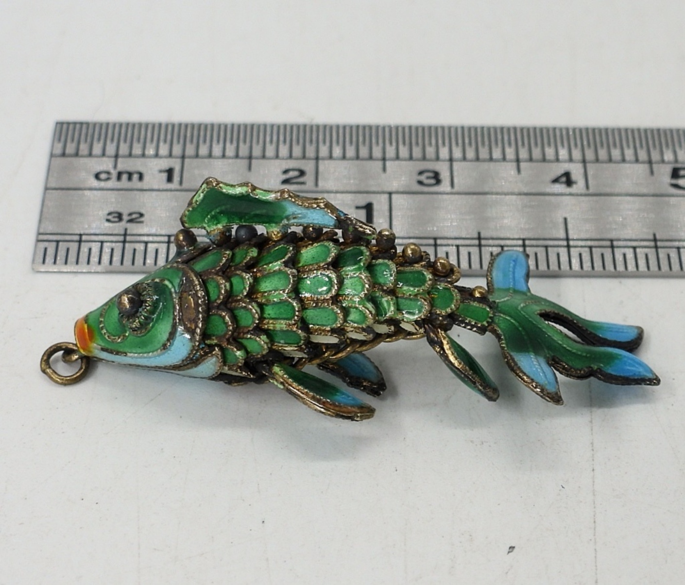 TINY CLOISONNE GREEN & BLUE ARTICULATED FISH PENDANT.