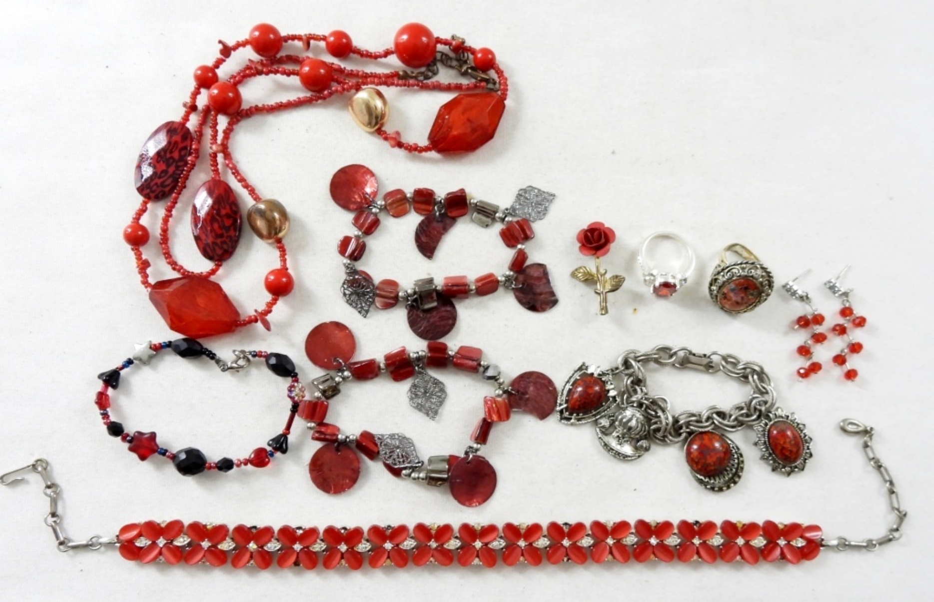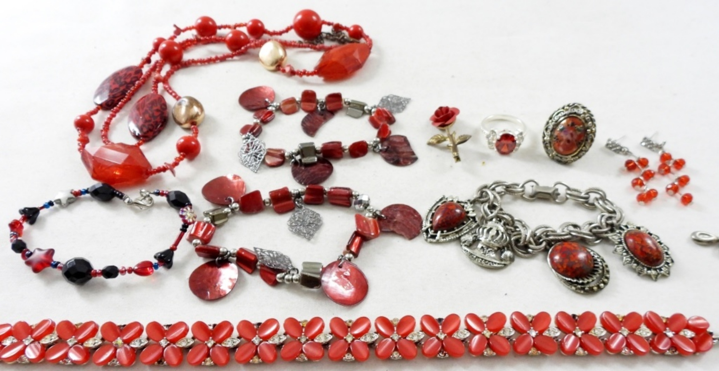 VINTAGE CHOCKER NECKLACE 16″ missing (6) rhinestones, LONG BEADED NECKLACE, BRACELETS, RINGS SIZE 9 & MORE